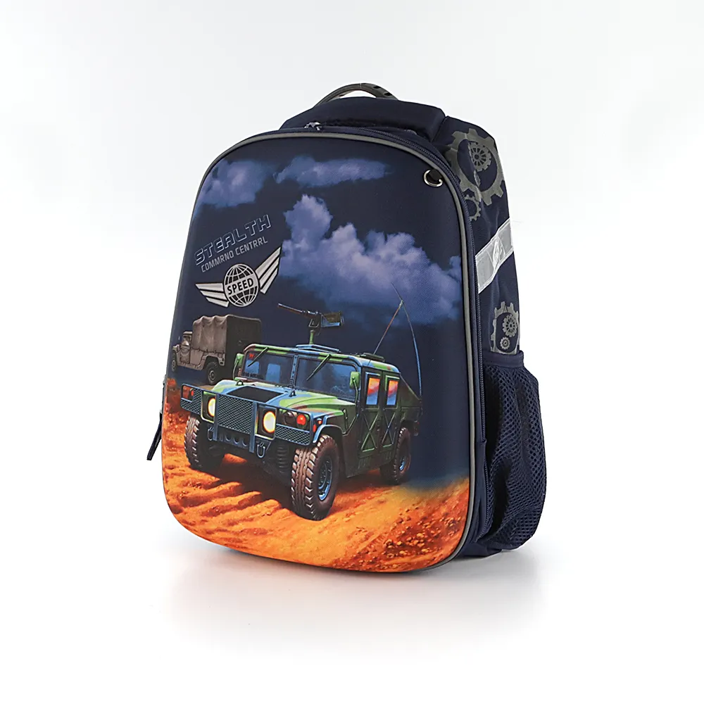 Ранец от торговой марки Ecotope из плотного текстильного материала. Декорирован рисунком в военной тематике с изображением бронемашины с радиолокатором. Модель с лямкой-переноской с пластиковой накладкой, мягкой набивной ручкой, регулируемыми плечевыми лямками с более износостойкой конструкцией в форме майки со светоотражателями, повышающими безопасность в темное время. Ортопедическая спинка с анатомическими вставками с верхним дышащим слоем. Два отделения на молнии, с текстильной подкладкой. В основном отделении – накладной карман и фиксирующая резинка. По бокам – карман-сетка. На лицевой стороне – кольцо для крепления брелока.