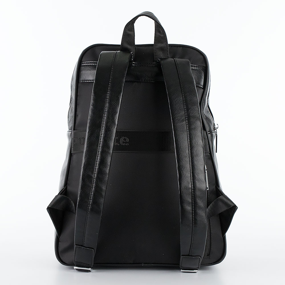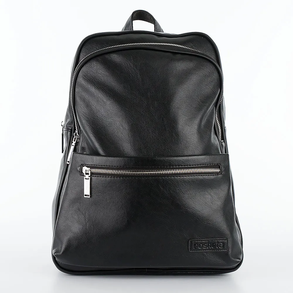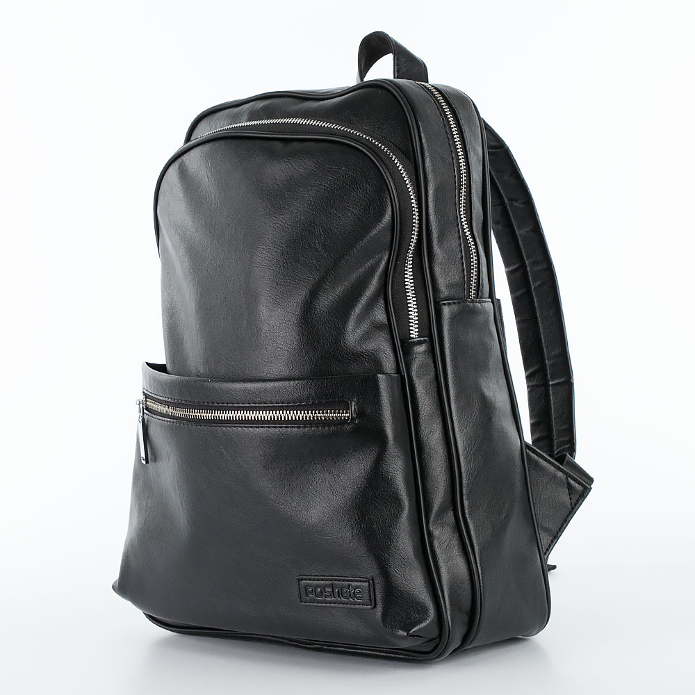 Рюкзак от торговой марки Poshete из искусственной кожи черного цвета. Модель с лямкой-переноской и регулируемыми плечевыми лямками. Два отделения на молнии, с фирменной подкладкой. В основном отделении – карман с уплотненной стенкой для ноутбука, карман на молнии. На лицевой стороне – два кармана на молнии. На спинке имеется лямка для крепления на выдвижную ручку чемодана.