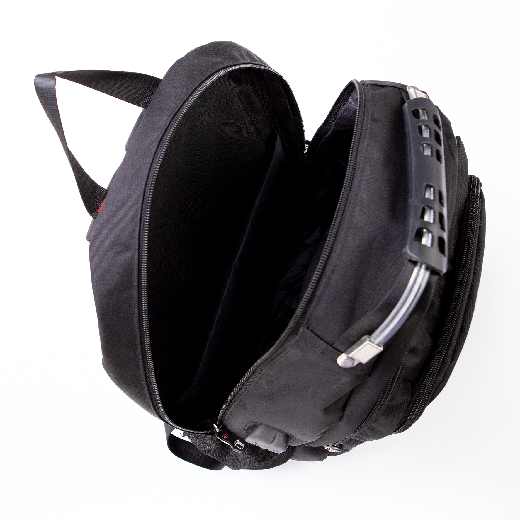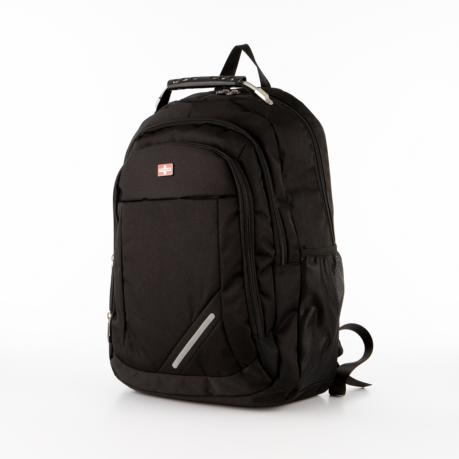Рюкзак от торговой марки Ecotope из прочного текстильного материала черного цвета. Вместительная модель с лямкой-переноской, ручкой с тросом и пластиковой накладкой, регулируемыми плечевыми лямками. Три отделения на молнии, с текстильной подкладкой. В основном отделении – накладной карман с уплотненной стенкой, два накладных кармана, отверстие к USB-выходу и выходу для наушников, расположенных снаружи сбоку. На лицевой стороне – светоотражатель, повышающий безопасность в темное время. Спинка с легкой анатомической вставкой; имеется карман-антивор на молнии с верхним дышащим сетчатым слоем. По бокам – карман-сетка.