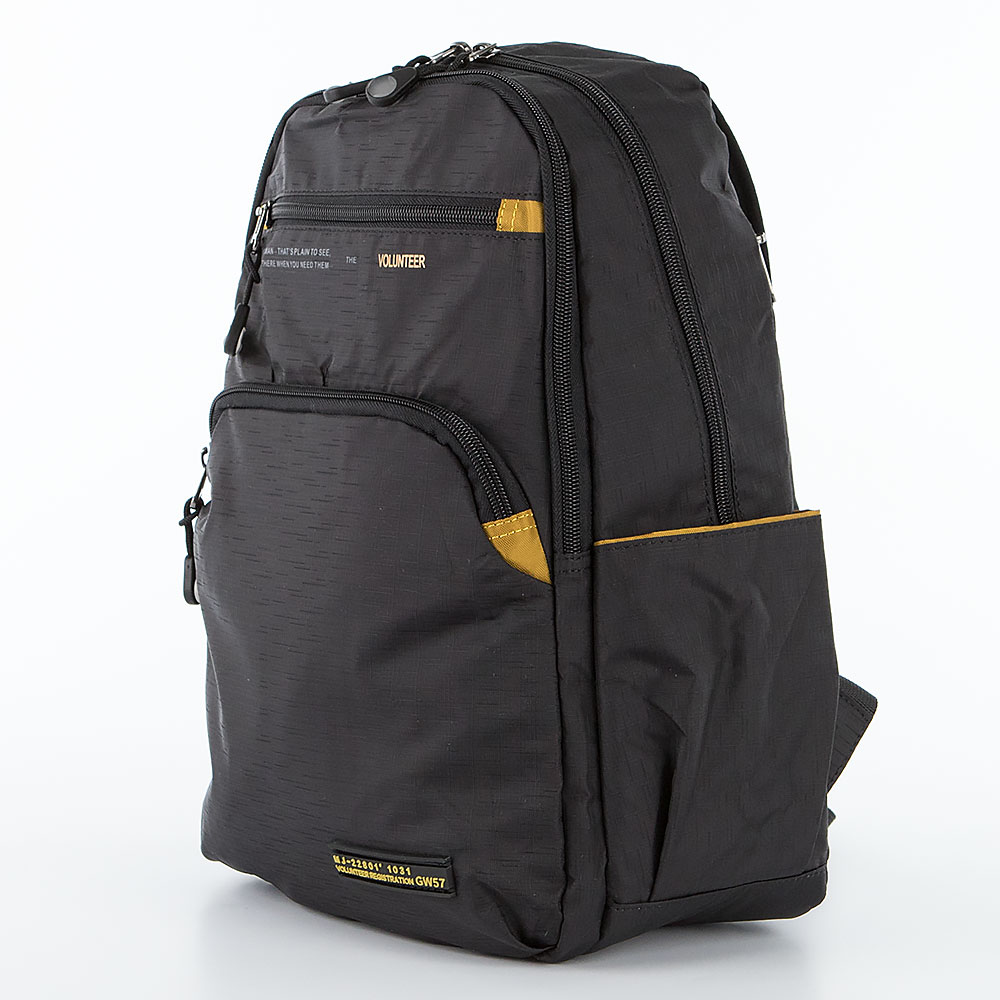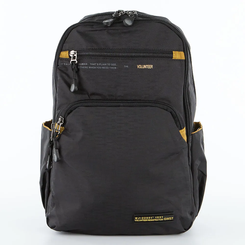 Рюкзак от торговой марки Volunteer из практичного прочного текстильного материала черного цвета. Модель с лямкой-переноской, регулируемыми плечевыми лямками с дышащим верхним слоем. Отделение на молнии. Внутри: текстильная подкладка, карман на молнии, карман с уплотненной стенкой, два накладных кармана. На лицевой стороне – два кармана на молнии. На задней стороне – карман на молнии. По бокам – карман без застежки.