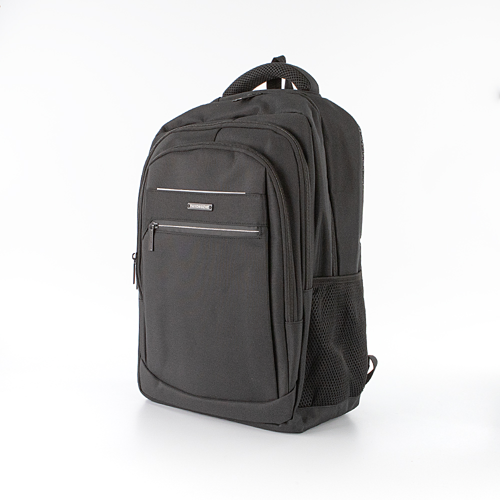 Рюкзак от торговой марки Tayongzhe из плотного практичного текстильного материала черного цвета. Модель с мягкой набивной ручкой, широкими регулируемыми плечевыми лямками с нагрудным фиксатором для равномерного распределения нагрузки. Спинка с анатомическими вставками и дышащим сетчатым верхним слоем. Два отделения на молнии, с текстильной подкладкой. В основном отделении – накладной карман с уплотненной стенкой. На лицевой стороне – два кармана на молнии, светоотражатель, повышающий безопасность в темное время. По бокам – карман-сетка.