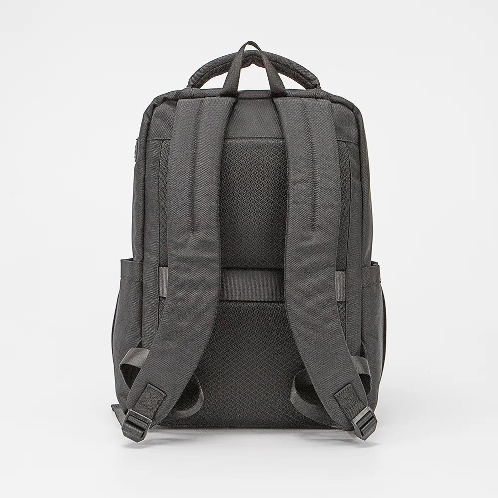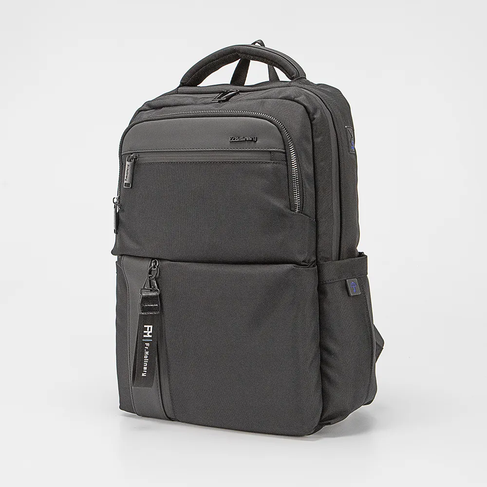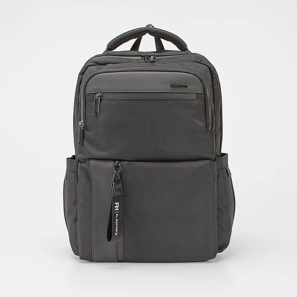 Функциональный рюкзак от торговой марки Francesco Molinary из прочного износостойкого текстильного материала черного цвета. Модель с лямкой для крепления, набивной ручкой, плотными широкими регулируемыми плечевыми лямками анатомической формы, лямкой для крепления на выдвижную ручку чемодана. Отделение на молнии с прорезиненной тесьмой. Внутри: фирменная подкладка, два накладных кармана с уплотненной стенкой для ноутбука и планшета, два кармана-сетки. На лицевой стороне – два накладных кармана; в верхнем – органайзер и кольцо для крепления; нижний карман с вертикальной молнией. Уплотненная спинка с дышащим верхним слоем. По бокам – накладной карман без застежки, USB-порт для подзарядки гаджетов с помощью внешнего портативного аккумулятора Power Bank.