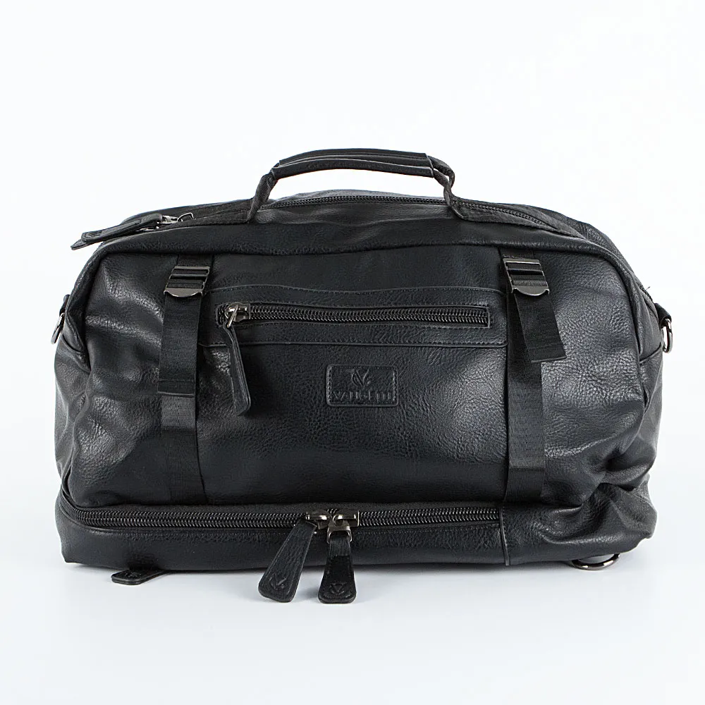 Сумка-рюкзак от торговой марки Valigetti из искусственной кожи черного цвета. Вместительная функциональная модель с лямкой-переноской, двумя ручками, съемным регулируемым плечевым ремнем, регулируемыми плечевыми лямками, которые складываются в карман на молнии, расположенный на спинке. Два отделения на молнии, с текстильной подкладкой. По бокам – стягивающие ремни. На лицевой и задней сторонах – карман на молнии. На спинке имеется лямка для крепления на выдвижную ручку чемодана.
