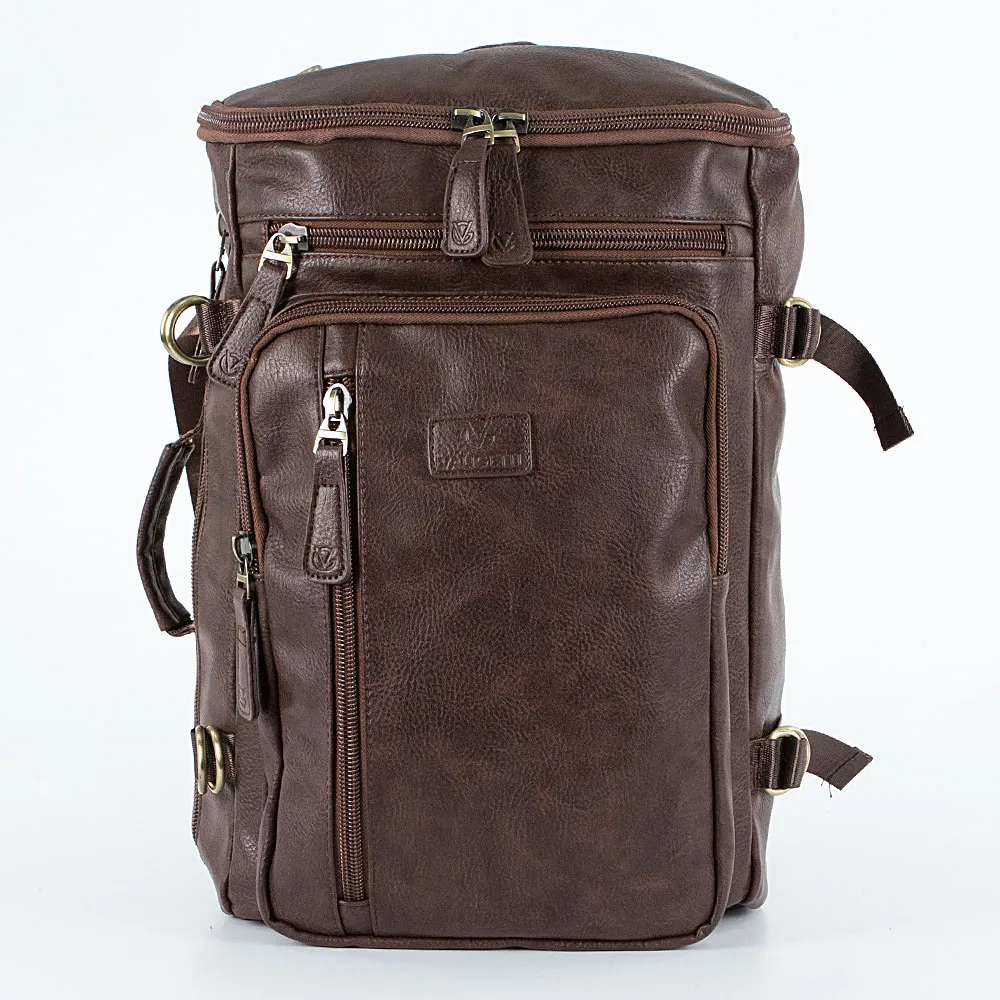 Сумка-рюкзак от торговой марки Valigetti из искусственной кожи коричневого цвета. Модель вертикальной и горизонтальной ориентации с одной ручкой, лямкой-переноской, съемным регулируемым плечевым ремнем длиной до 102 см, регулируемыми плечевыми лямками, которые можно спрятать за широкой лямкой на спинке. Два входа в отделение на молнии – в двух положениях. Внутри: фирменная подкладка, карман на молнии, накладной карман с уплотненной стенкой для ноутбука, два накладных кармана. На лицевой стороне – три кармана на молнии. По бокам имеются стягивающие ремни.