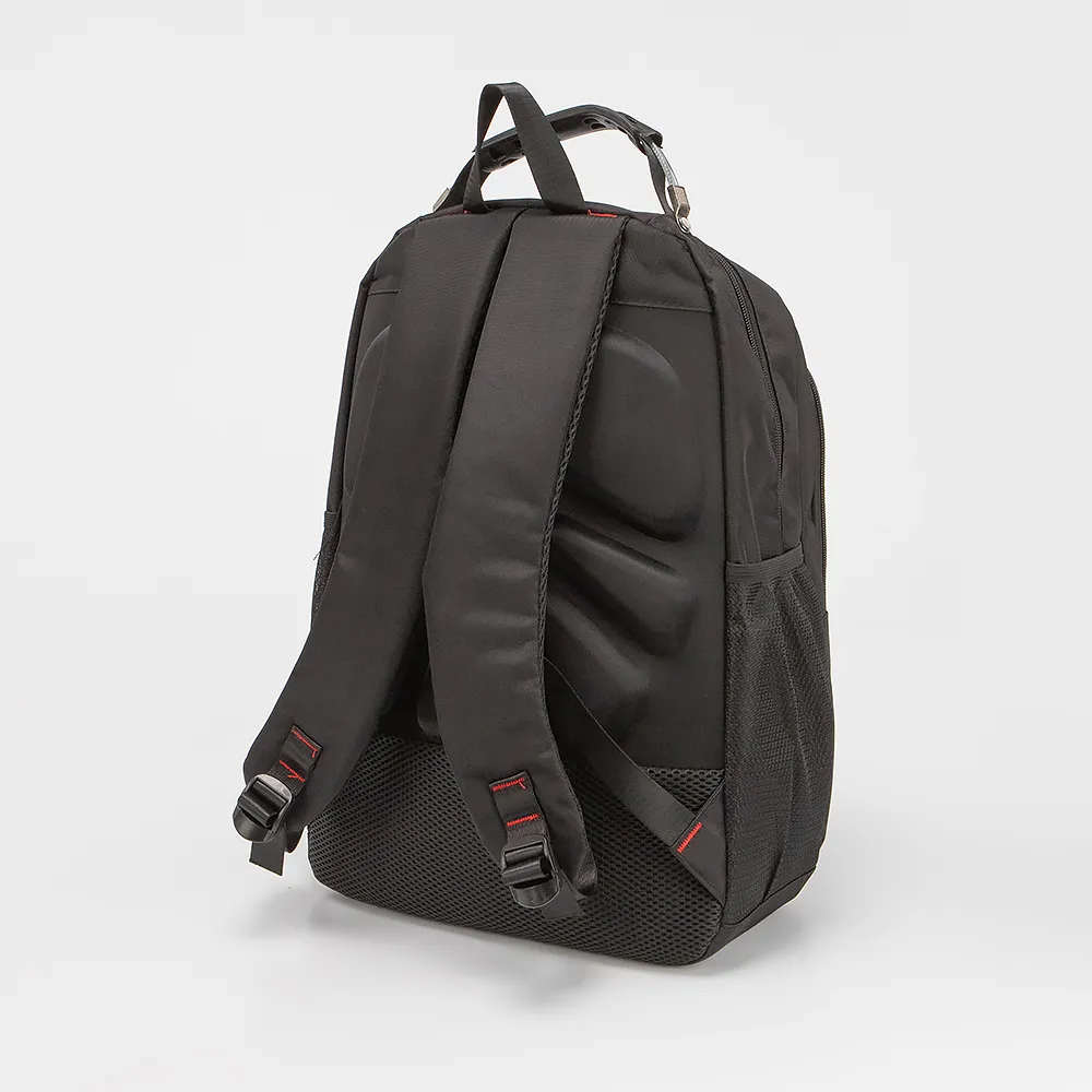 Рюкзак от торговой марки Ecotope из практичного плотного текстильного материала черного цвета. Модель с лямкой-переноской, ручкой с металлическим тросом и прорезиненной накладкой и широкими регулируемыми плечевыми лямками. Три отделения на молнии, с текстильной подкладкой. В основном отделении – накладной карман с уплотненной стенкой; имеется кодовый замок. На лицевой стороне – карман на молнии. По бокам – карман-сетка; имеется USB-порт и выход для наушников. Удобная спинка с анатомическими вспененными вставками и нижней частью с верхним дышащим сетчатым слоем.