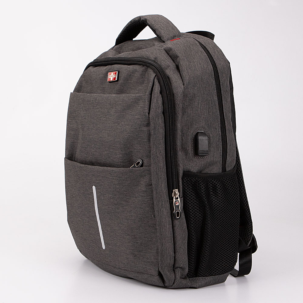 Рюкзак от торговой марки Ecotope из практичного текстильного материала меланжевого серого цвета. Модель с мягкой набивной ручкой, лямкой, широкими регулируемыми плечевыми лямками с дышащим сетчатым слоем. На спинке имеется накладной карман без застежки. Отделение на молнии. Внутри: текстильная подкладка, накладной карман с уплотненной стенкой для ноутбука. На лицевой стороне – два кармана на молнии. По бокам – карман-сетка. Сбоку имеется USB-порт.