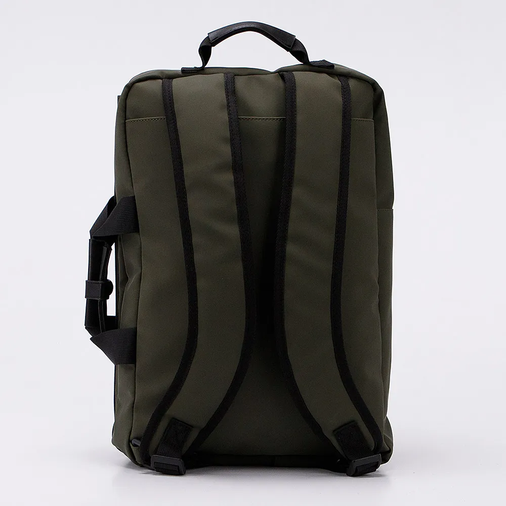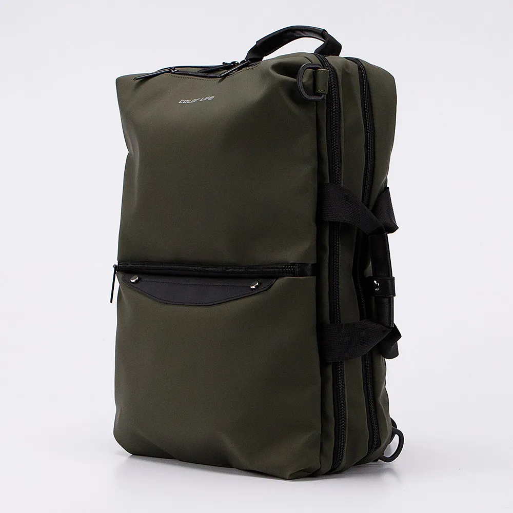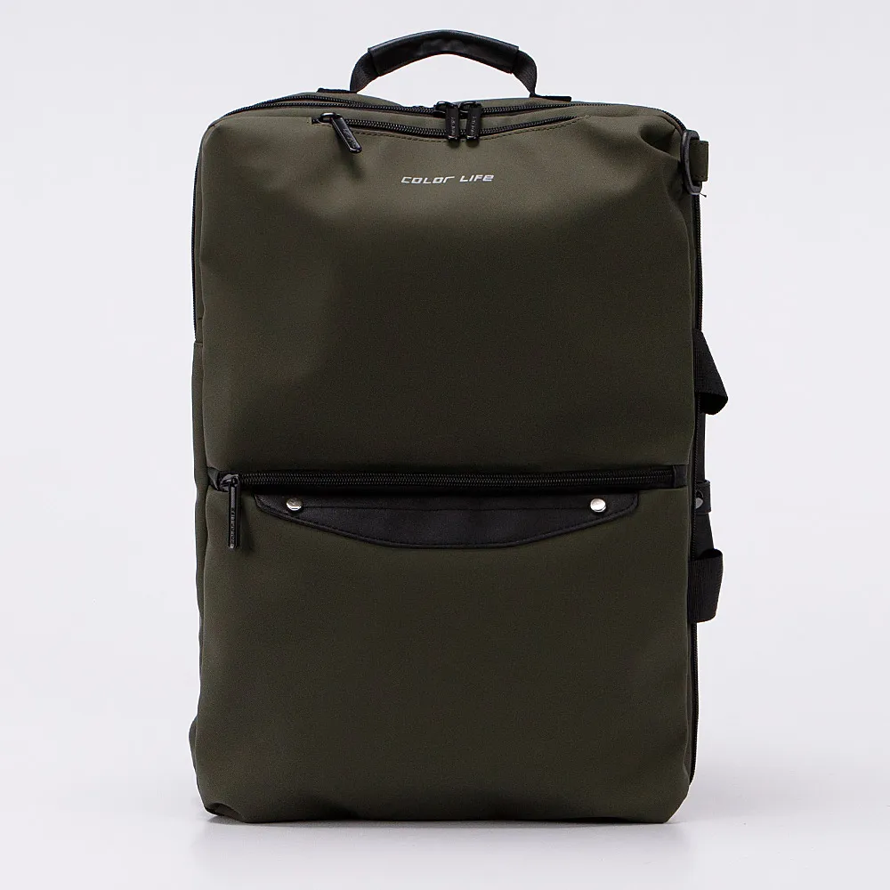 Сумка-рюкзак от торговой марки Color Life из непромокаемого текстильного материала и искусственной кожи цвета хаки. Модель с ручкой-переноской, двумя ручками с фиксатором на кнопке, съемным регулируемым плечевым ремнем, двумя регулируемыми плечевыми лямками, которые складываются в накладной карман на магнитной кнопке. Два отделения на молнии, с текстильной подкладкой. В переднем отделении – два кармана-сетки; в заднем – накладной карман с уплотненной стенкой для ноутбука. На лицевой стороне – два кармана на молнии.