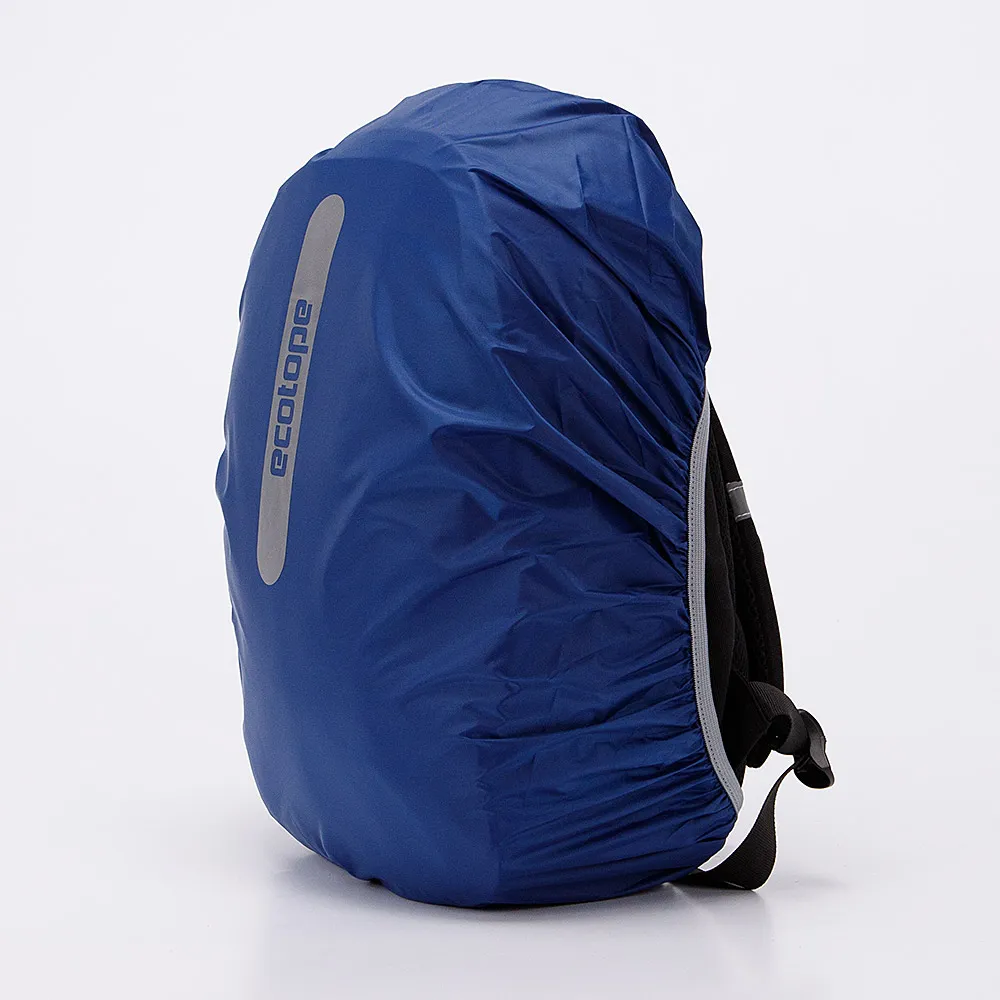 Чехол от торговой марки Ecotope из прочного практичного текстильного материала с полиуретановым покрытием, отражающим ультрафиолетовые лучи, что защищает от нагрева, а также обеспечивает водонепроницаемость и ветрозащиту. Модель с эластичной фиксирующей резинкой по краям. На лицевой стороне – светоотражающий принт с названием бренда. Чехол надежно защитит рюкзак от загрязнений, влаги и солнечных лучей. Модель темно-синего цвета; размер подходит для рюкзаков объемом 35 литров.