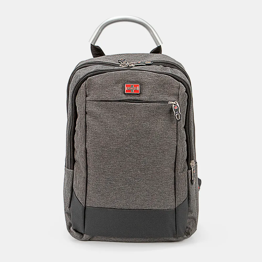 Рюкзак от торговой марки Ecotope из практичного текстильного материала серого цвета и вставкой из искусственной кожи. Модель с одной ручкой, усиленной алюминиевой трубкой, широкими набивными регулируемыми плечевыми лямками. Уплотненная спинка с анатомической вставкой и лямкой для крепления на выдвижную ручку чемодана. Отделение на молнии. Внутри: текстильная подкладка, карман с уплотненной стенкой. На лицевой стороне – вместительный карман на молнии и карман на скрытой молнии. Сбоку – накладной карман без застежки.