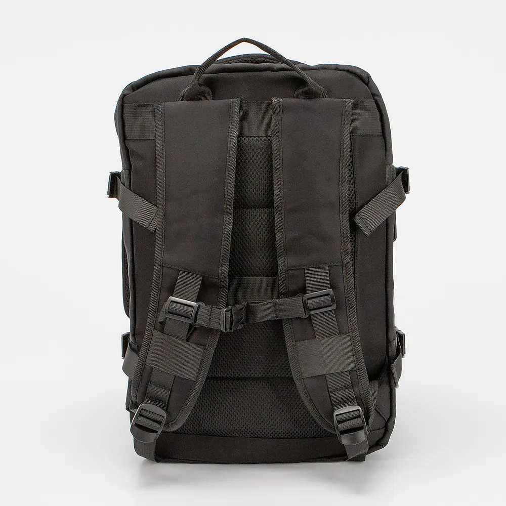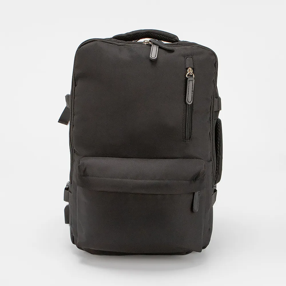 Рюкзак из текстильного материала черного цвета. Модель с лямкой и двумя ручками-переносками (сверху и сбоку), широкими регулируемыми плечевыми лямками с дышащим сетчатым верхним слоем и фиксирующим ремнем с застежкой. Отделение на молнии. Внутри: текстильная подкладка, накладной карман. На лицевой стороне - два кармана на молнии. По бокам имеются дополнительные ремни для фиксации с застежками фастекс, а так же встроенный USB-порт, обеспечивающий удобное соединение для подзарядки аккумуляторов мобильных устройств от внешнего источника питания.