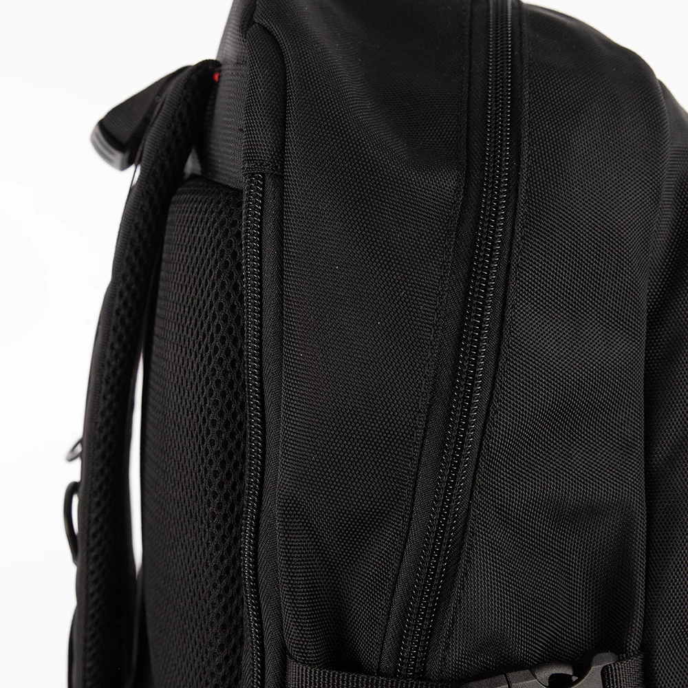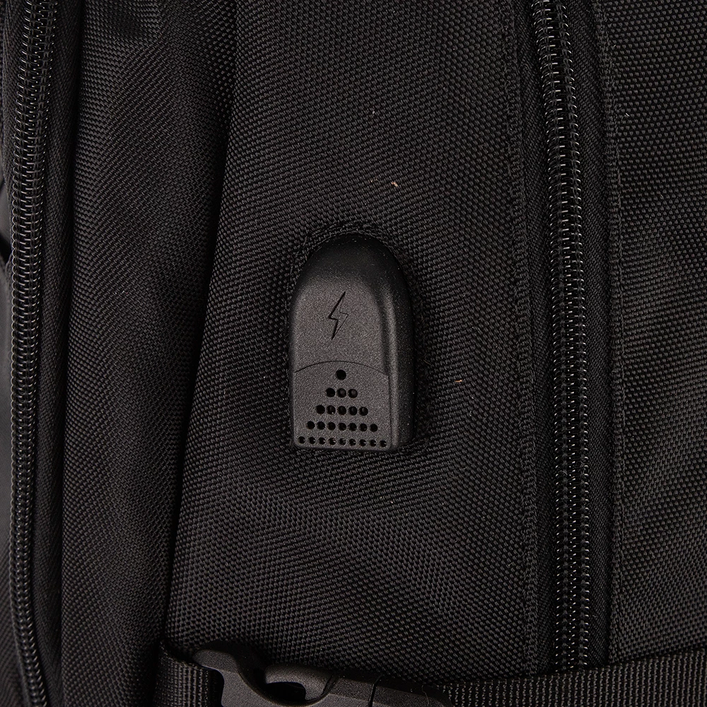 Функциональный рюкзак от бренда Francesco Molinary из прочного износостойкого текстильного материала черного цвета. Модель большого размера с лямкой-переноской с прорезиненной накладкой, плотными широкими регулируемыми плечевыми лямками с ремнями для крепления и нагрудным фиксатором для распределения нагрузки. Спинка с дышащими вставками; имеется лямка для крепления на выдвижную ручку чемодана. Глубокое отделение на молнии. Внутри: фирменная подкладка, накладной карман с уплотненной стенкой для ноутбука, USB-кабель для внешнего портативного аккумулятора Power Bank, при подключении которого можно подзаряжать гаджеты через USB-порт, расположенный снаружи сбоку. По бокам – стягивающие ремни, карман-сетка на резинке. На лицевой стороне – два накладных кармана, вместительное отделение с органайзером для канцелярских принадлежностей; снизу карман на молнии, представляющий собой непромокаемое вентилируемое отделение для обуви (снаружи на нем имеется лямка для крепления). На задней стороне – раздвижка на молнии для увеличения объема. Рюкзак идеален для поездок и путешествий.