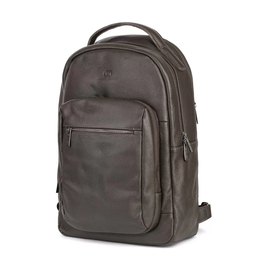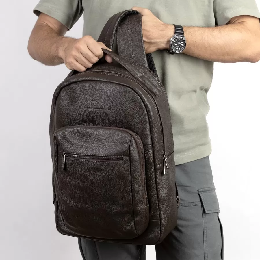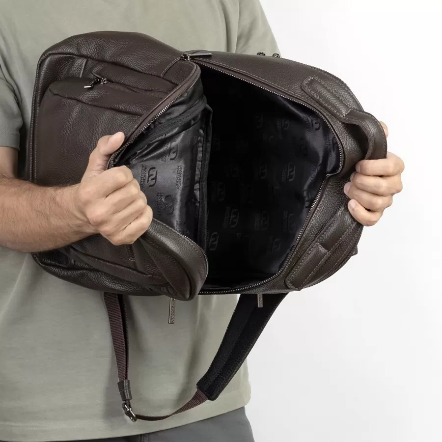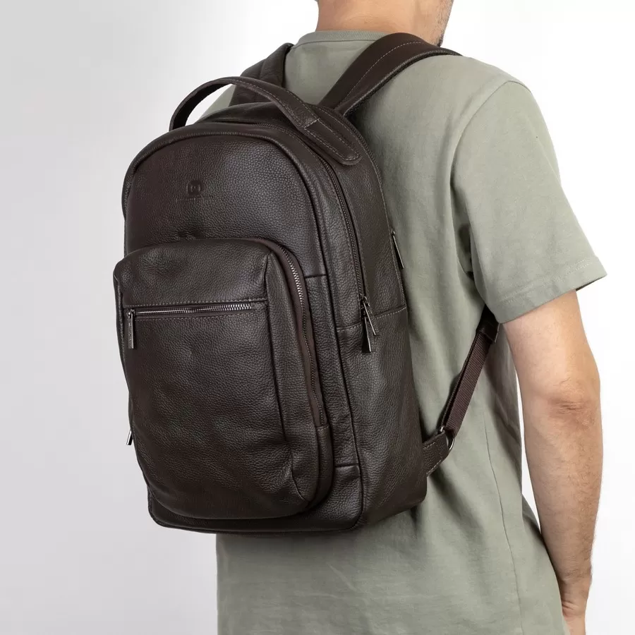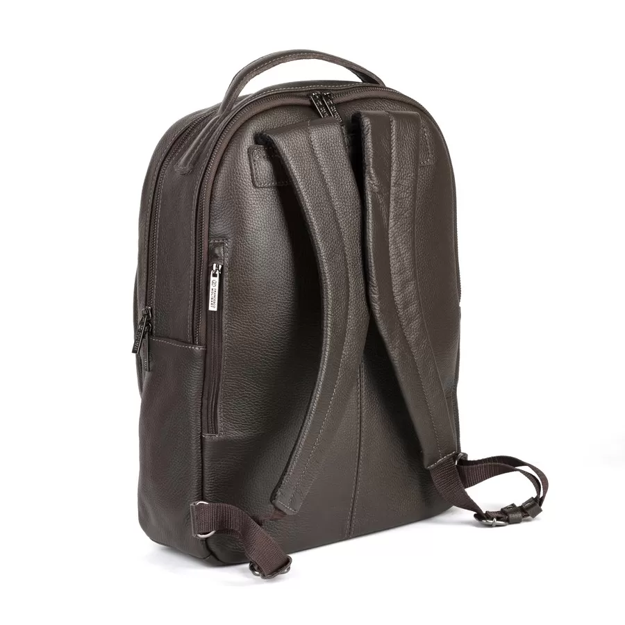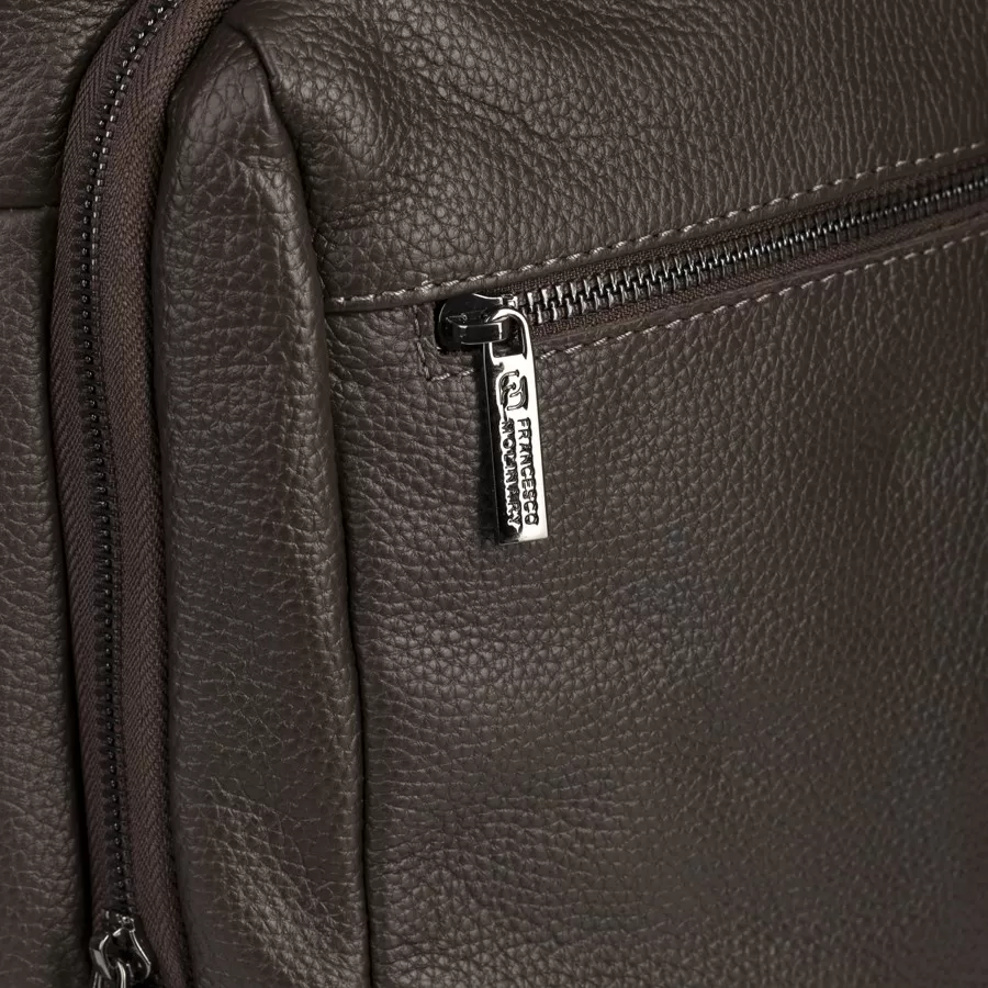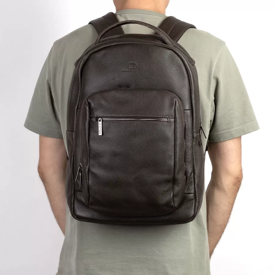 Вместительный мужской рюкзак Francesco Molinary темно-коричневого цвета из натуральной кожи с естественной фактурой. Внутри фирменная подкладка, все карманы и отделения на металлических молниях. Основное отделение с двумя отсеками. Отделение под ноутбук с двумя отсеками и потайным карманом на молнии. Спереди малое отделение с 2мя отсеками и отдельный карман на молнии. Широкие крепкие кожаные лямки. Также есть отдельный плечевой карман