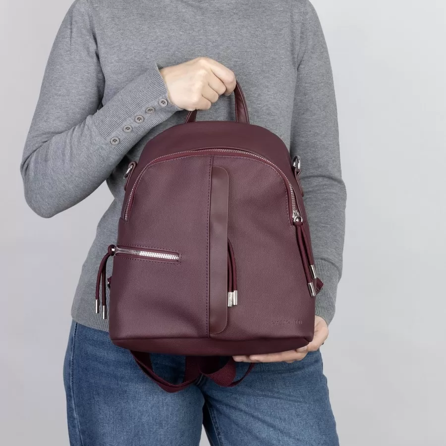 Рюкзак от торговой марки Valigetti из искусственной кожи бордового цвета. Модель с лямкой-переноской, уплотненными регулируемыми плечевыми лямками. Одно отделение на молнии, с фирменной подкладкой. В основном отделении: карман на молнии, накладной карман. На лицевой и задней сторонах – карман на молнии.