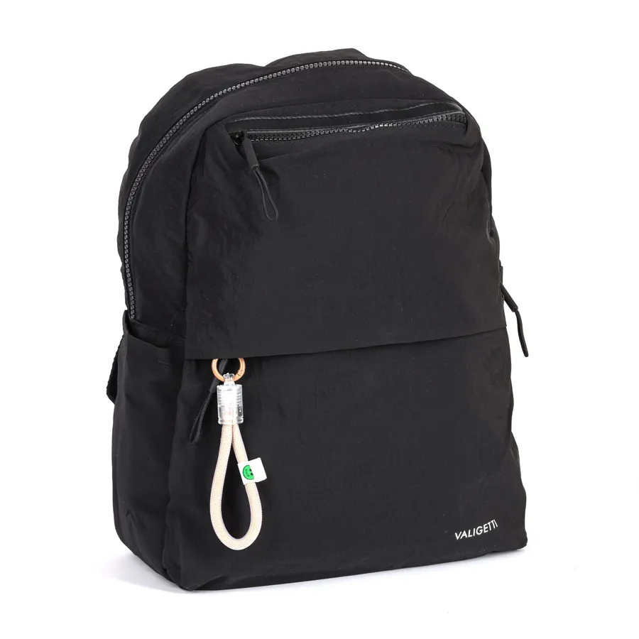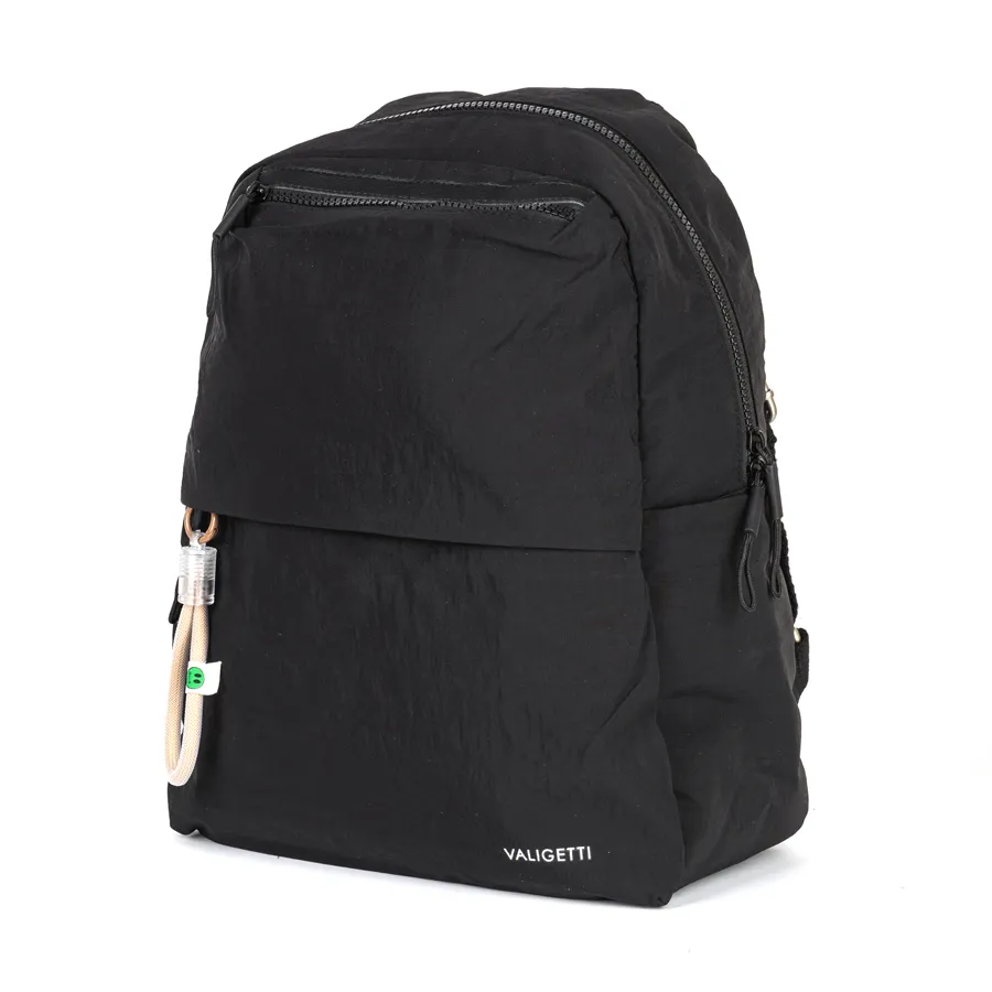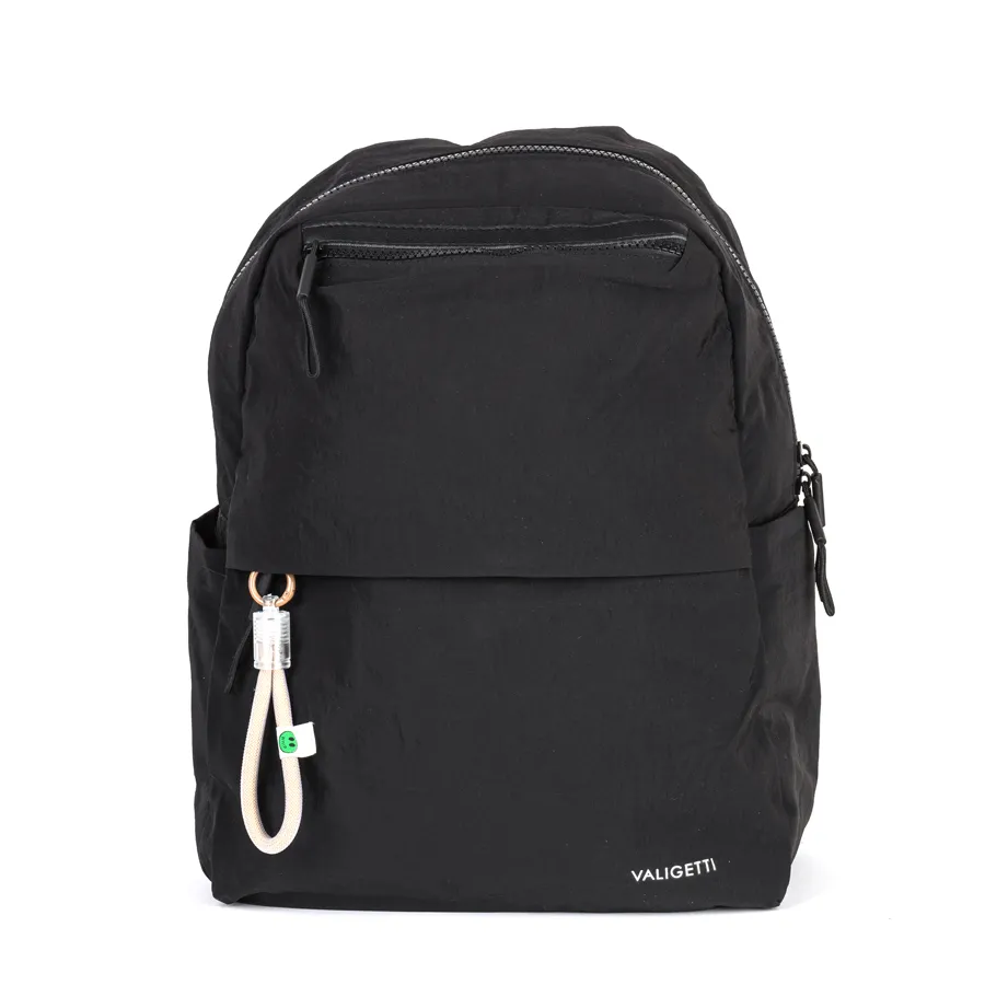 Рюкзак бренда Valigetti из текстиля черного цвета. Имеет плечевые лямки и вшитую текстильную ручку. Внутри основного отделения есть карман на молнии и открытый кармашек. На лицевой стороне есть на молнии. По бокам 2 открытых сетчатых кармашка. С задней стороны есть карман на молнии. С задней стороны есть ремень фиксации на ручке чемодана