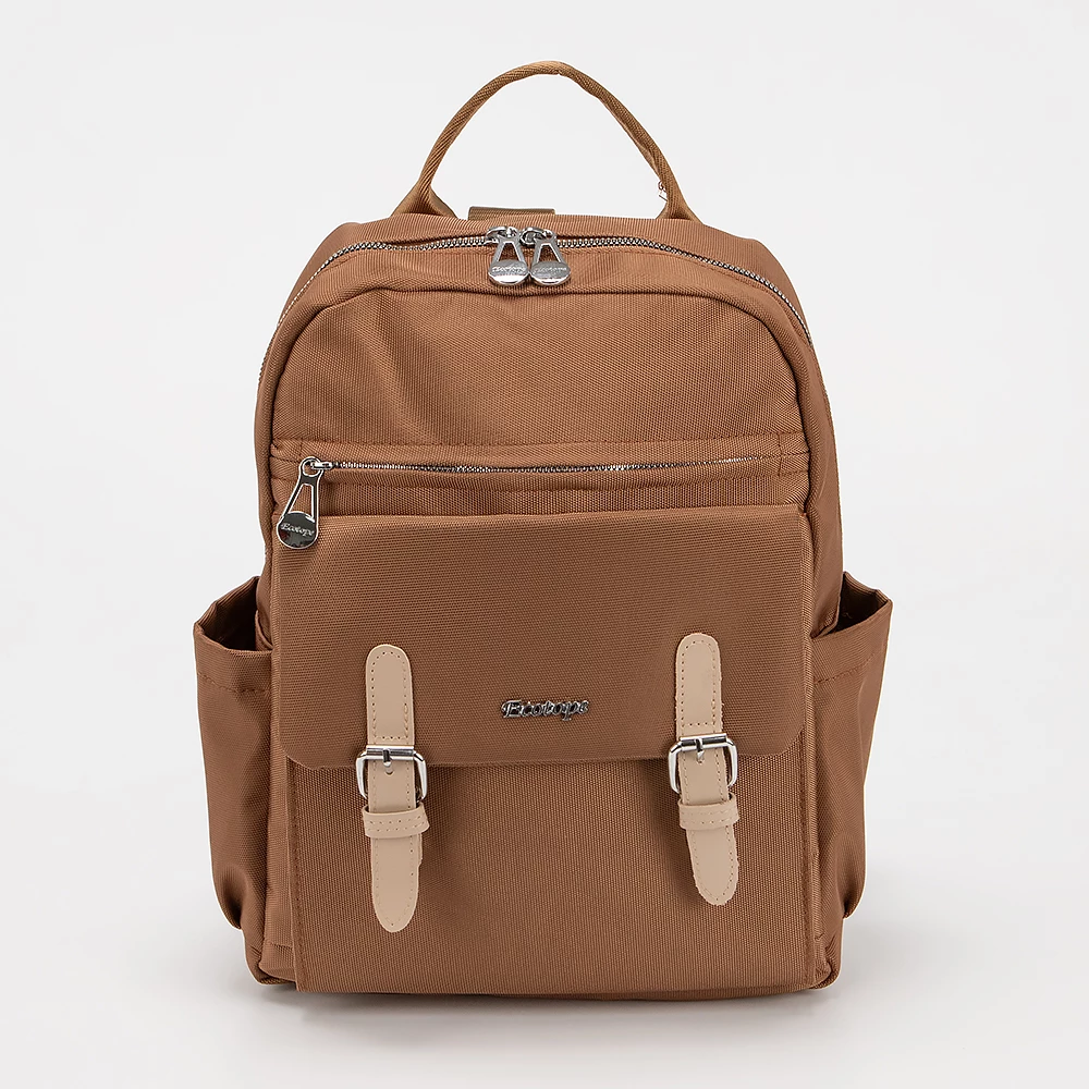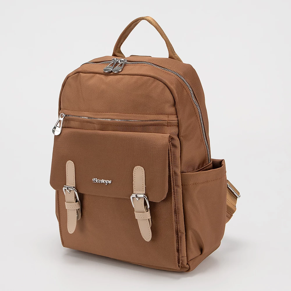 Рюкзак от бренда Ecotope из практичного текстильного материала коричневого цвета. Модель с ручкой-переноской, регулируемыми плечевыми ремнями. Основное отделение на молнии. Внутри: текстильная подкладка, накладной карман. На лицевой стороне – два кармана на молнии, накладной карман с клапаном на металлических застежках. По бокам – накладной карман.