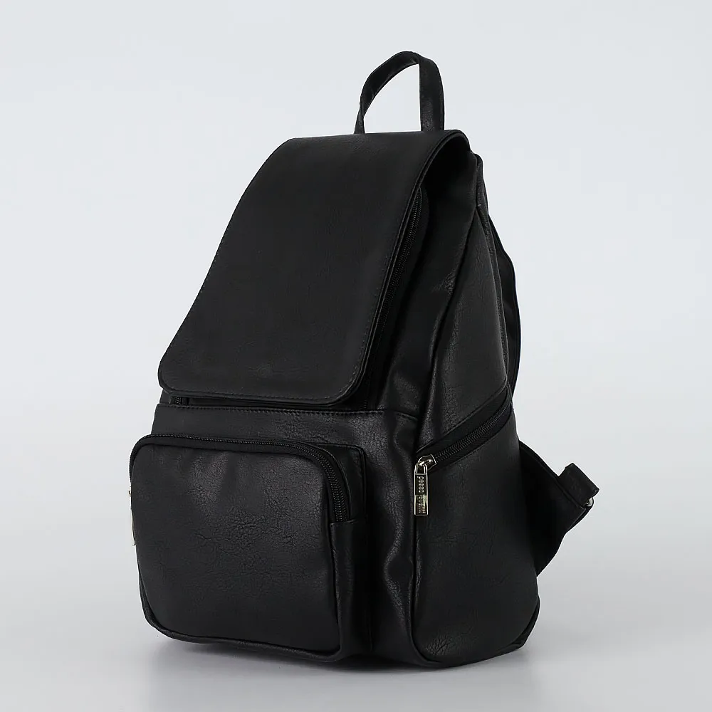 Рюкзак от торговой марки Passo Avanti из искусственной кожи черного цвета. Модель с лямкой-переноской и регулируемым плечевыми лямка ми. Закрывается клапаном. Отделение на молнии. Внутри: фирменная подкладка, карман на молнии, два накладных кармана. На лицевой стороне – накладной карман на молнии. По бокам и на спинке – карман на молнии.