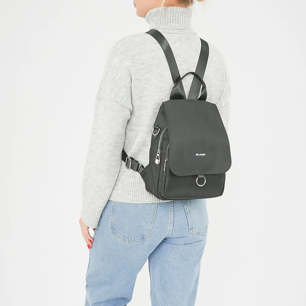 Сумка-рюкзак от торговой марки Ecotope из плотного текстильного материала черного цвета. Модель с лямкой-переноской, регулируемыми п лечевыми лямками и съемным плечевым ремнем. Клапан на магнитной кнопке закрывает два отделения на молнии, с текстильной подкладкой; на клапане имеется кольцо для крепления. В основном отделении - перегородка с карманом на молнии, образующая накладной карман. На задней стороне – карман на молнии.
