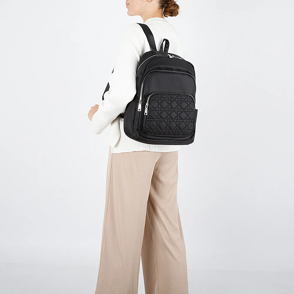 Женский рюкзак Ecotope выполнен из гладкого текстильного материала чёрного цвета декорирован стёжкой на переднем кармане. Модель с р учкой для переноса и двумя текстильными плечевыми лямками. Основное отделение на молнии, внутри текстильная подкладка, спереди два кармана на молниях, по бокам карманы без застёжек, на «спинке» карман на молнии.