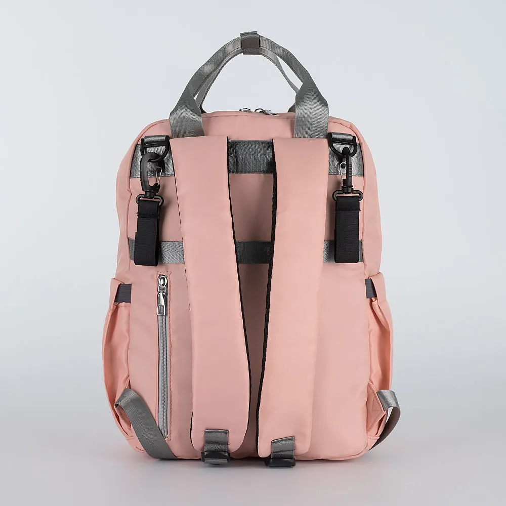 Рюкзак для мам от торговой марки Ecotope из текстильного материала светло-розового цвета. Лицевая сторона декорирована ромбовидной с тежкой. Модель с двумя ручками с фиксатором на кнопке и регулируемыми плечевыми лямками и съемными ремнями-липучками для фиксации рюкзака на коляску. Отделение на молнии. Внутри: текстильная подкладка, накладной карман с уплотнённой стенкой, карман на молнии, два накладных кармана-сетки, по бокам – резинки для фиксации бутылочек. На лицевой стороне – карман на молнии и липучке. На стенке – три термокармана. Карман раскрывается на 90 градусов и представляет собой раскладной пеленальный матрас с непромокаемой стороной; фиксируется липучками. На задней стороне – вертикальный карман на молнии, лямка для крепления на выдвижную ручку чемодана. По бокам – карманы без застежки на резинке, имеется карман на молнии для быстрого доступа.