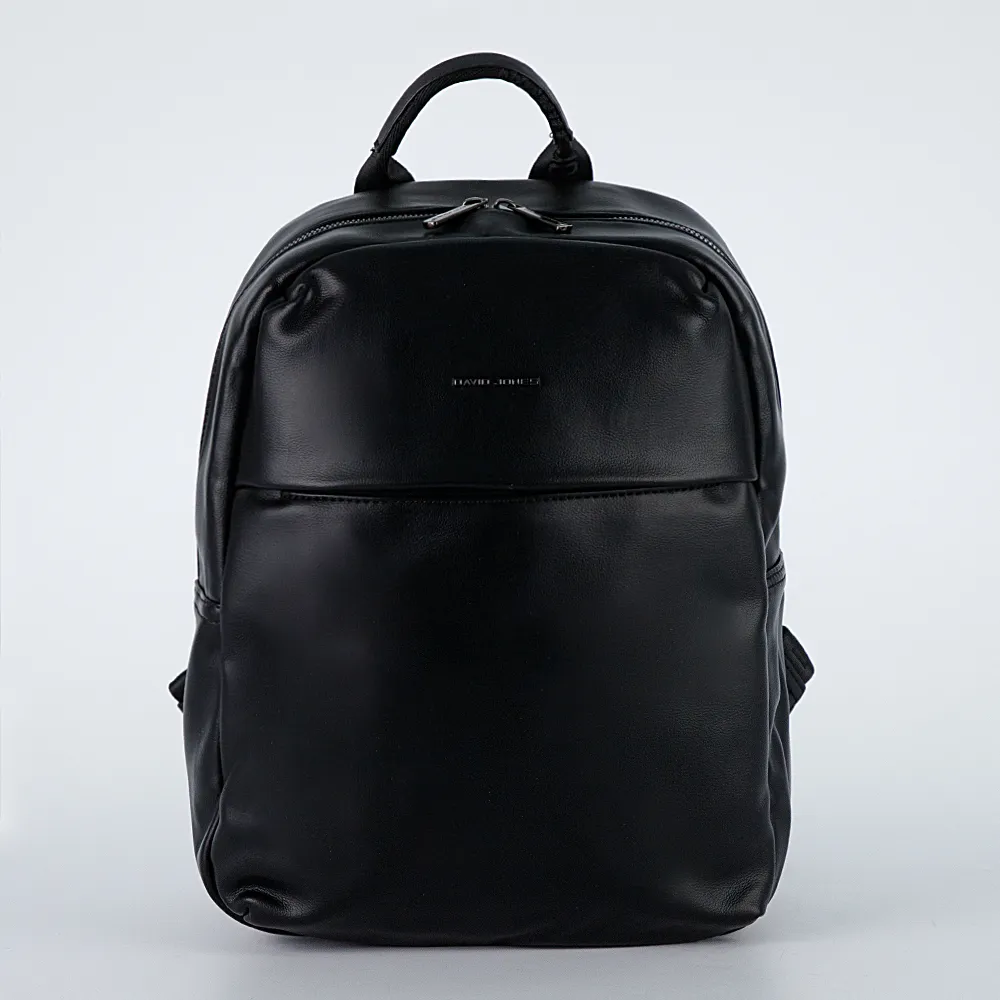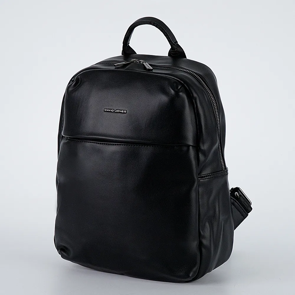 Рюкзак от торговой марки David Jones из искусственной кожи черного цвета. Модель с плотной лямкой и регулируемыми плечевыми лямками. Отделение на молнии. Внутри: фирменная подкладка, карман на молнии, накладной карман, карман с уплотненной стенкой на липучке. На лицевой и задней сторонах – карман на молнии.