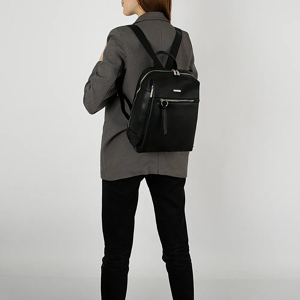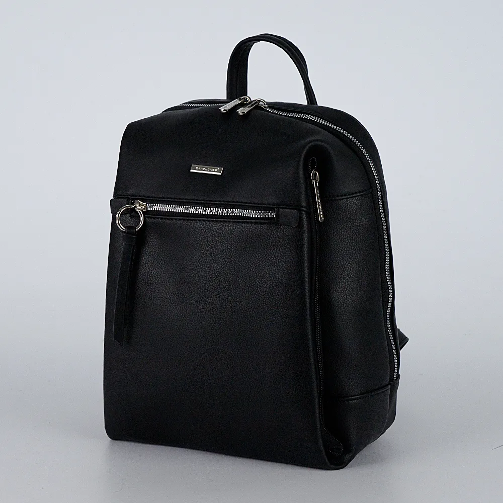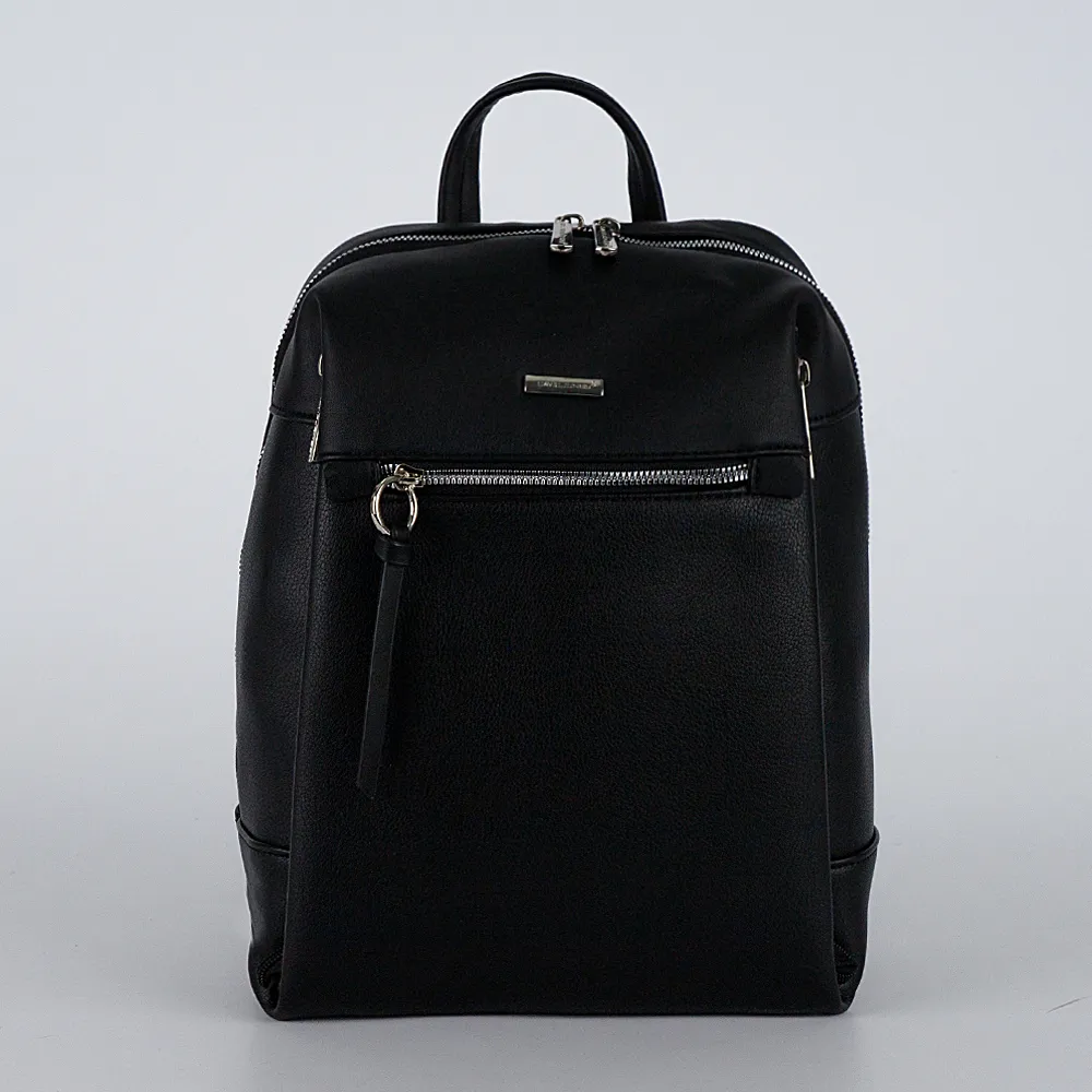Стильный рюкзак от торговой марки David Jones выполнен из искусственной кожи черного цвета. Модель с плотной ручкой-переноской, узки ми регулируемыми плечевыми лямками. Отделение на молнии по трем сторонам с двумя бегунками. Внутри: фирменная подкладка, два больших накладных кармана. На передней стороне – карман на молнии с кожаным пуллером и два вертикальных кармана на молнии по сторонам. На задней стороне – карман на молнии.