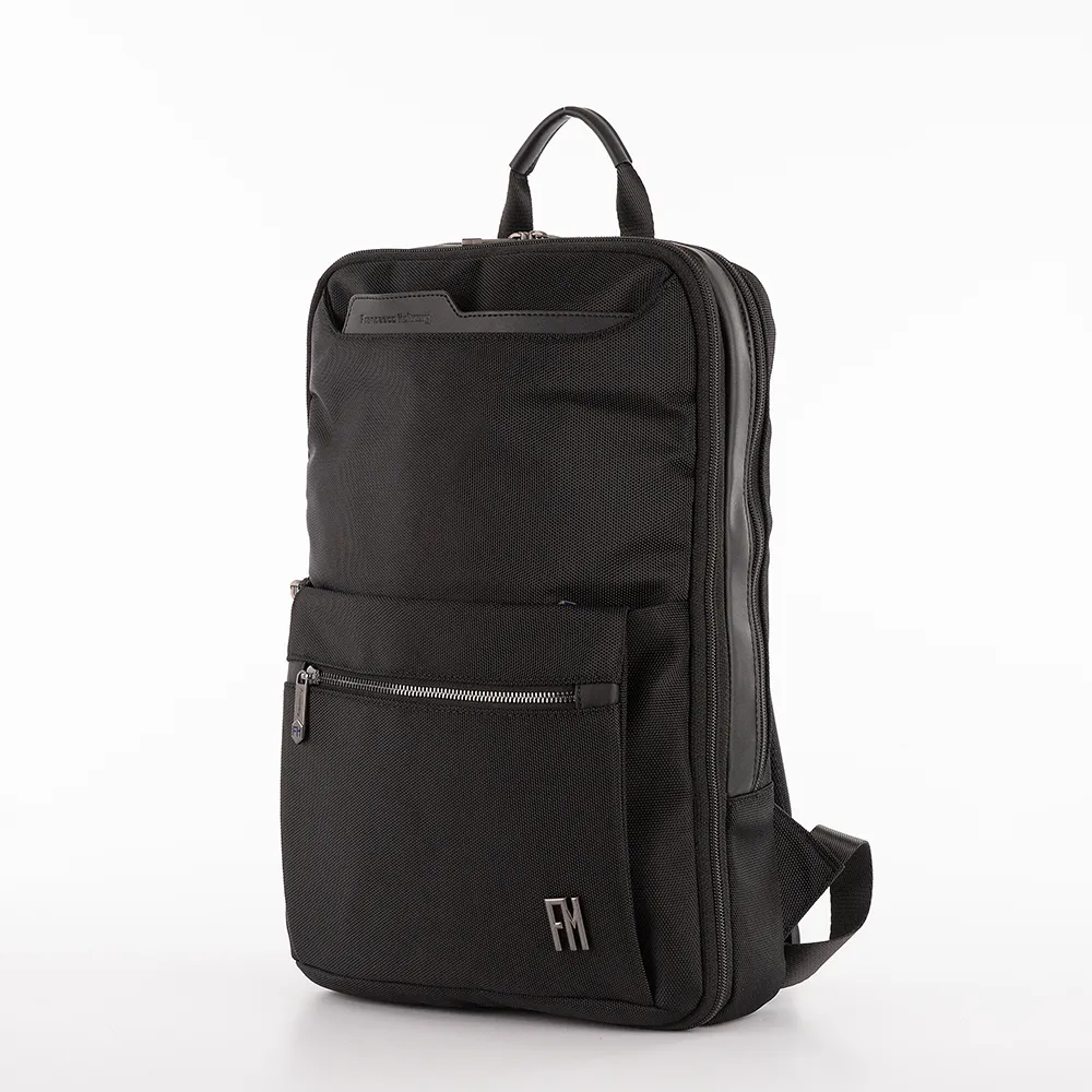 Функциональный рюкзак от торговой марки Francesco Molinary из прочного износостойкого текстильного материала оксфорд плотностью 1680 Ден черного цвета. Модель с удобной лямкой-переноской, регулируемыми плечевыми лямками и лямкой для крепления на выдвижную ручку чемодана. Уплотненная спинка с дышащим слоем. Спереди имеется раздвижка на молнии для увеличения объема рюкзака. Отделение на молнии. Внутри: фирменная подкладка, карман с уплотненной стенкой для ноутбука, три накладных кармана. На лицевой стороне – три кармана на молнии, в том числе с органайзером.