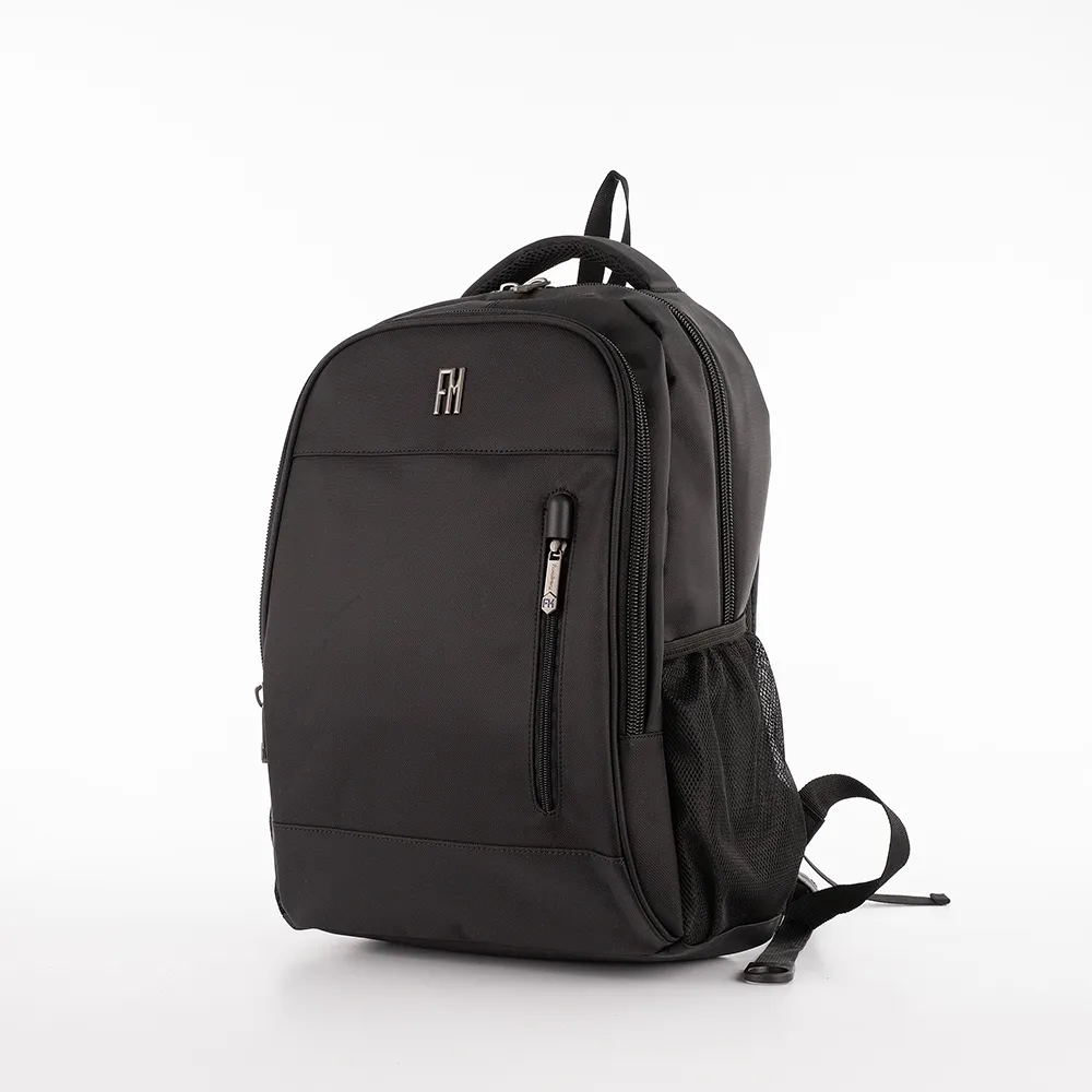 Функциональный рюкзак от торговой марки Francesco Molinary из прочного износостойкого текстильного материала черного цвета. Модель с лямкой-переноской, плотной ручкой, регулируемыми плечевыми лямками с нагрудным фиксатором и лямкой для крепления на выдвижную ручку чемодана. Уплотненная спинка с дышащим верхним слоем. Два отделения на молнии, с фирменной подкладкой. В основном отделении – карман с уплотненной стенкой для ноутбука. В переднем отделении – органайзер. На лицевой стороне – вертикальный карман на молнии. По бокам – карман-сетка на резинке, выход для наушников.