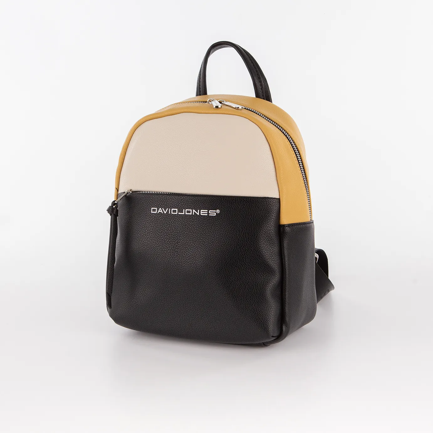 Рюкзак от торговой марки David Jones из искусственной кожи черного цвета с декоративными вставками бежевого и желтого цвета. Модель с лямкой-переноской и регулируемыми плечевыми лямками, выполненными из текстильного материала. Отделение на молнии. Внутри: фирменная подкладка, карман на молнии, накладной карман. На лицевой и задней сторонах – карман на молнии.