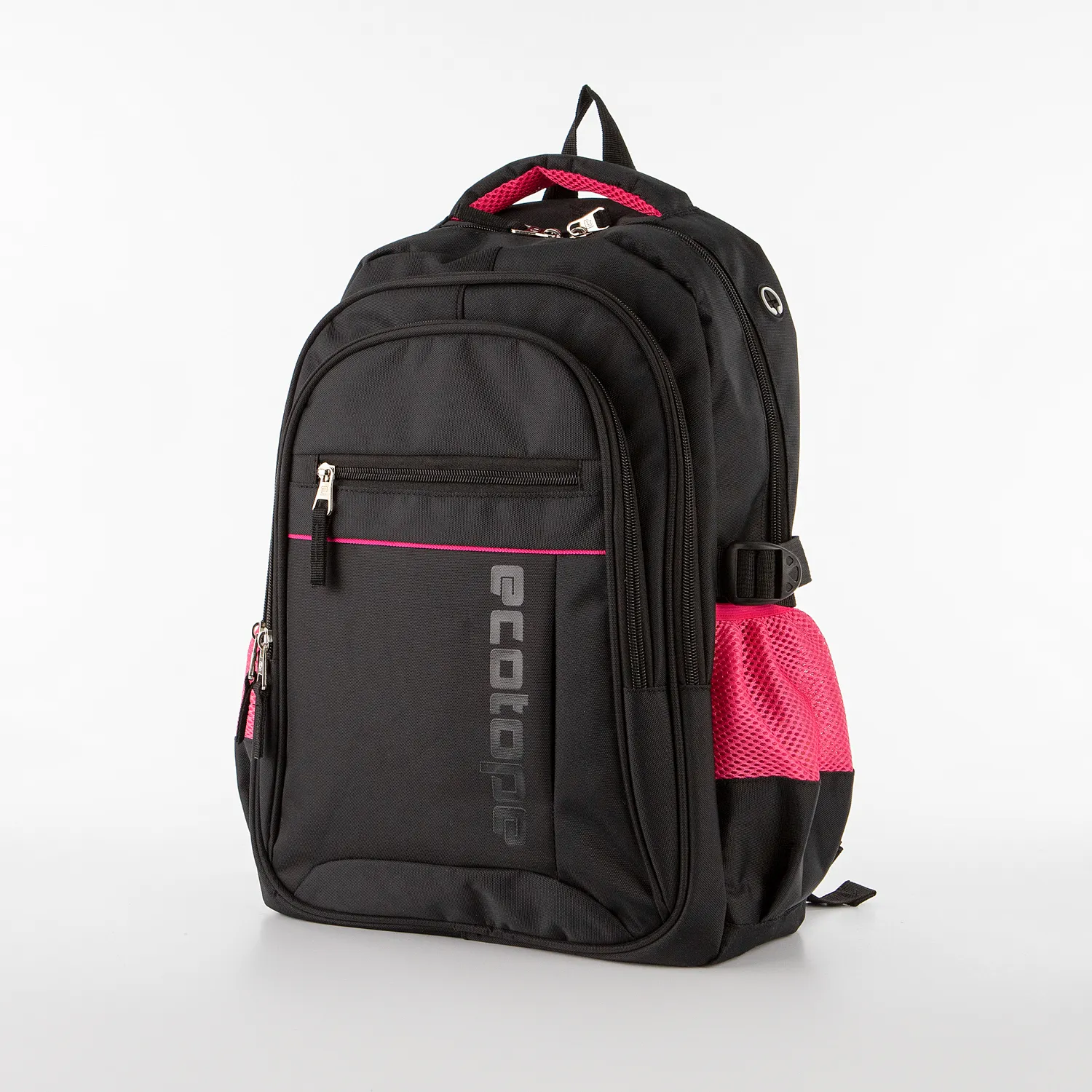 Рюкзак от торговой марки Ecotope из текстильного материала черного цвета с вставками цвета фуксия. Модель с лямкой-переноской, плотной ручкой, регулируемыми плечевыми лямками. Два отделения на молнии, с текстильной подкладкой. В основном отделении – накладной карман. На лицевой стороне – два кармана на молнии. По бокам – карман-сетка на резинке, стягивающие ремни на застежке фастекс. Сбоку имеется отверстие для наушников.