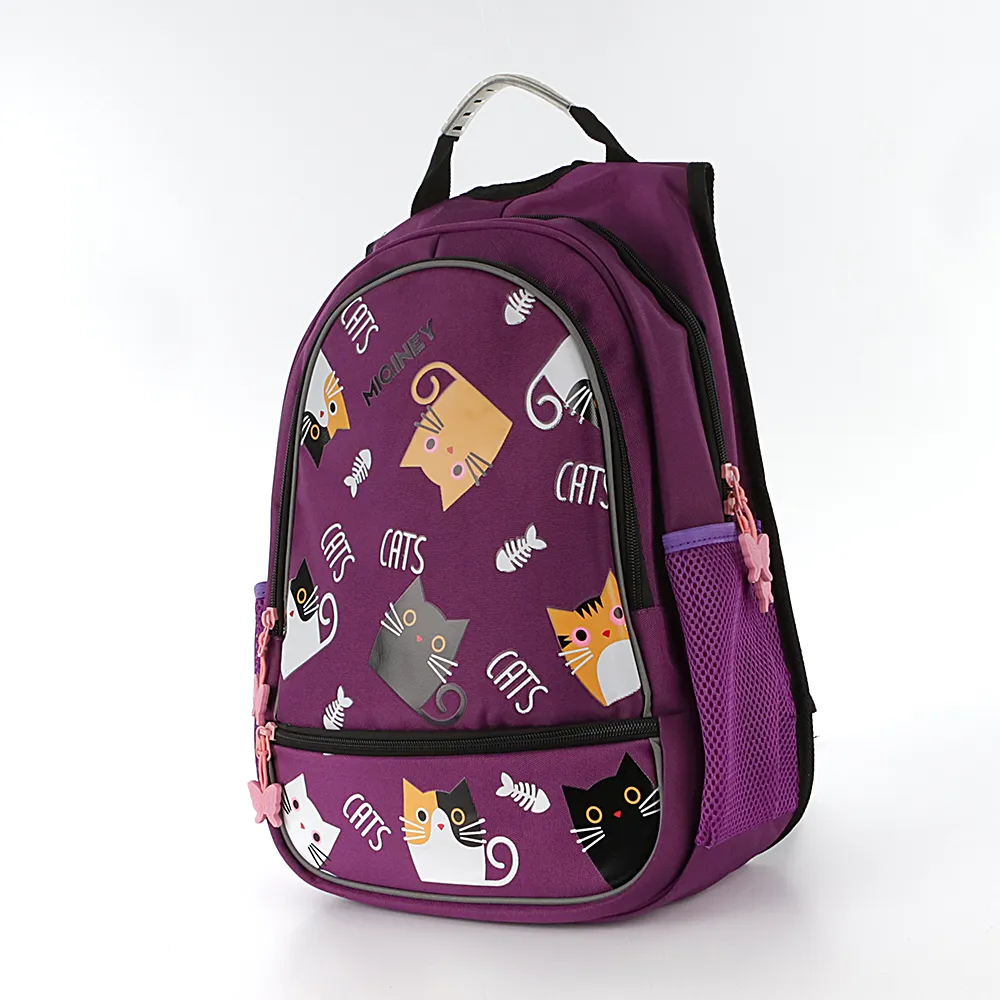 Рюкзак от торговой марки Miqini из практичного текстильного материала фиолетовего цвета. Декорирован ярким принтом с кошками. Модель с лямкой-переноской с пластиковой накладкой и регулируемыми плечевыми лямками прочной конструкции в виде майки. Отделение на молнии. Внутри: текстильная подкладка, накладной карман. На лицевой стороне – два кармана на молнии. По бокам – карман-сетка на молнии. Спинка с мягкими анатомическими накладками; на плечевых лямках – светоотражатели, повышающие безопасность в темное время.