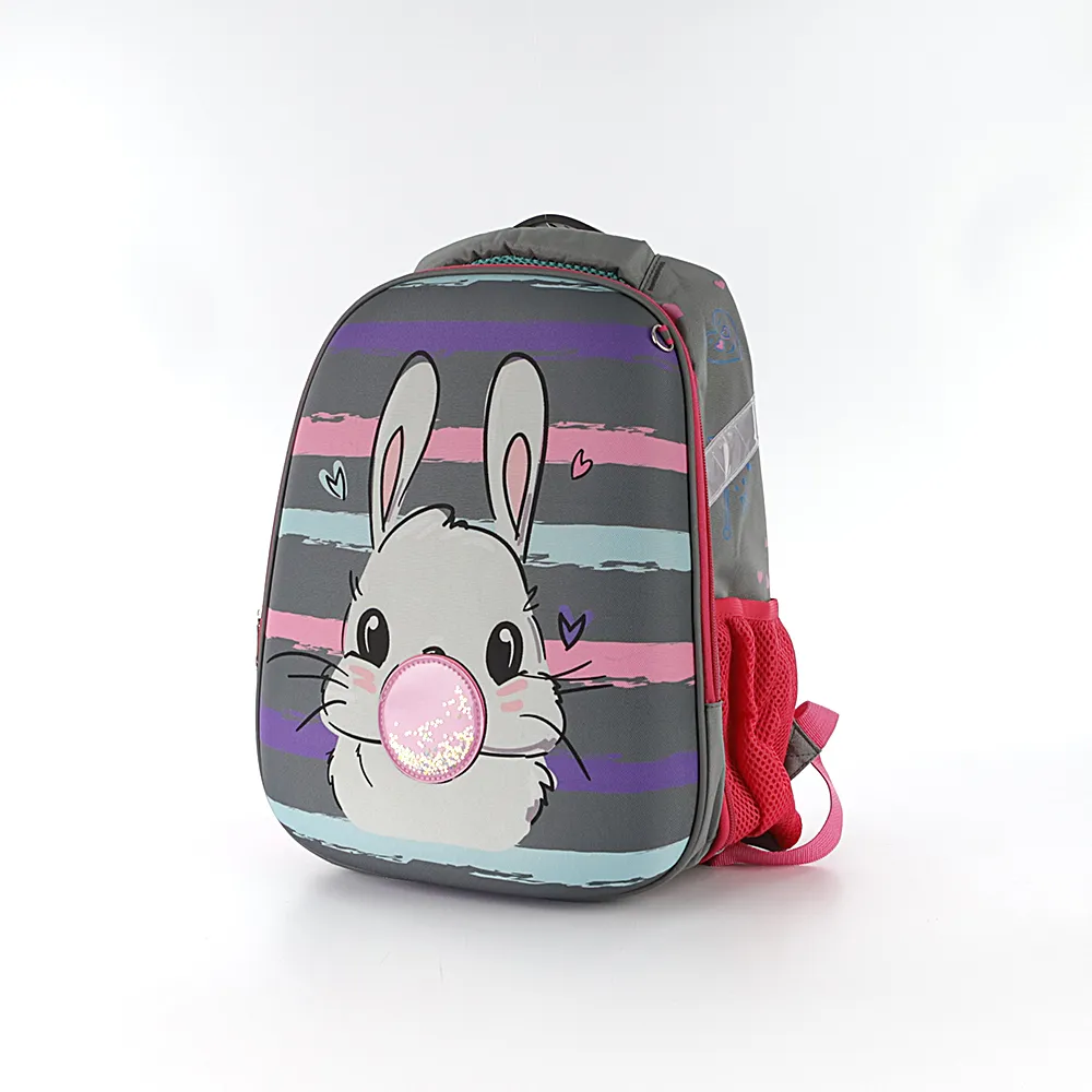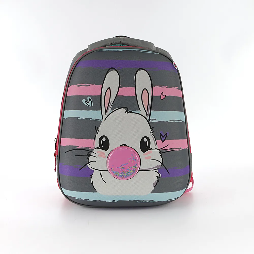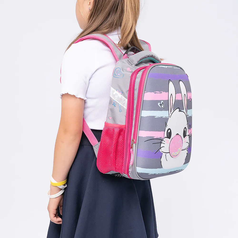 Ранец от торговой марки Ecotope из плотного текстильного материала. Декорирован рисунком с изображением зайчика, надувающего жвачку в виде аппликации с мерцающими звездочками внутри. Модель с лямкой-переноской с пластиковой накладкой, мягкой набивной ручкой, регулируемыми плечевыми лямками с более износостойкой конструкцией в форме майки со светоотражателями, повышающими безопасность в темное время. Ортопедическая спинка с анатомическими вставками с верхним дышащим слоем. Два отделения на молнии, с текстильной подкладкой. В основном отделении – накладной карман и фиксирующая резинка. По бокам – карман-сетка. На лицевой стороне – кольцо для крепления брелока.