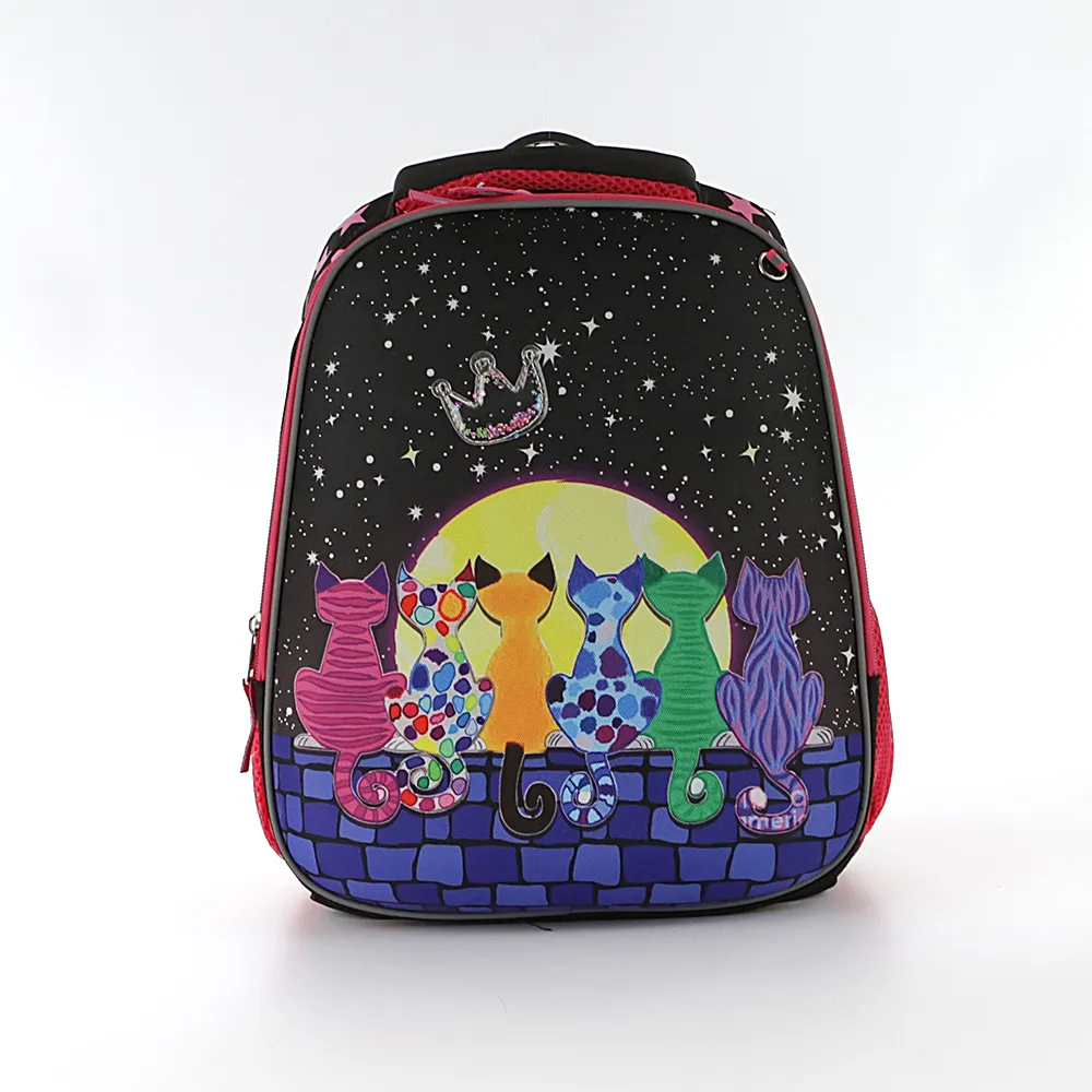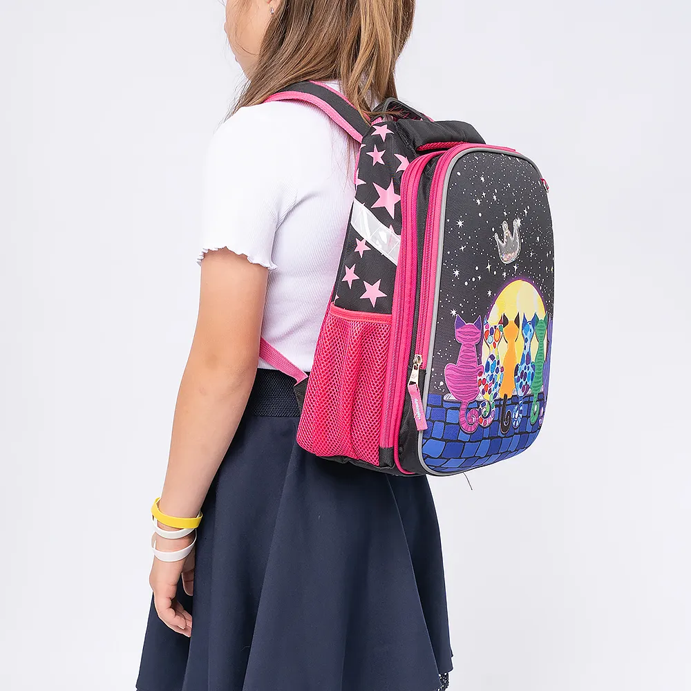 Ранец от торговой марки Ecotope из плотного текстильного материала. Декорирован рисунком с изображением кошек на фоне луны и звезд; имеется прозрачная аппликация в виде короны с мерцающими звездочками. Модель с лямкой-переноской с пластиковой накладкой, мягкой набивной ручкой, регулируемыми плечевыми лямками с более износостойкой конструкцией в форме майки со светоотражателями, повышающими безопасность в темное время. Ортопедическая спинка с анатомическими вставками с верхним дышащим слоем. Два отделения на молнии, с текстильной подкладкой. В основном отделении – накладной карман и фиксирующая резинка. По бокам – карман-сетка. На лицевой стороне – кольцо для крепления брелока.