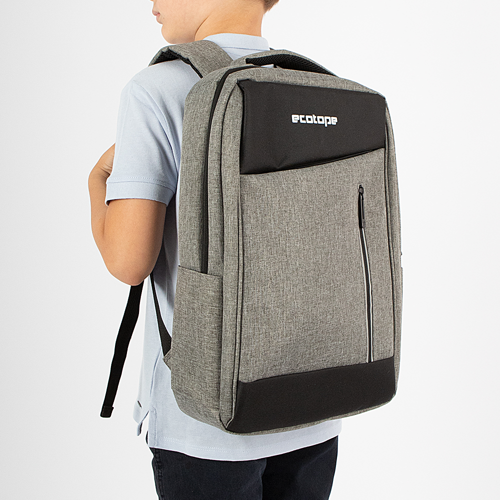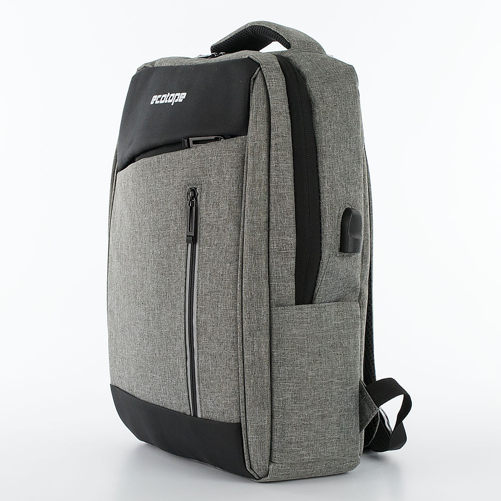 Рюкзак от торговой марки Ecotope из плотного текстильного материала в сочетании серого и черного цвета. Модель с плотной ручкой и широкими регулируемыми плечевыми лямками. Уплотненная спинка с дышащим сетчатым верхним слоем и лямкой для крепления на выдвижную ручку чемодана. Отделение на молнии. Внутри: накладной карман с уплотненной стенкой для ноутбука, органайзер из накладных карманов. На лицевой стороне – два карман на молнии со светоотражателем, повышающим безопасность в темное время. По бокам – накладной карман без застежки; имеется USB-выход.