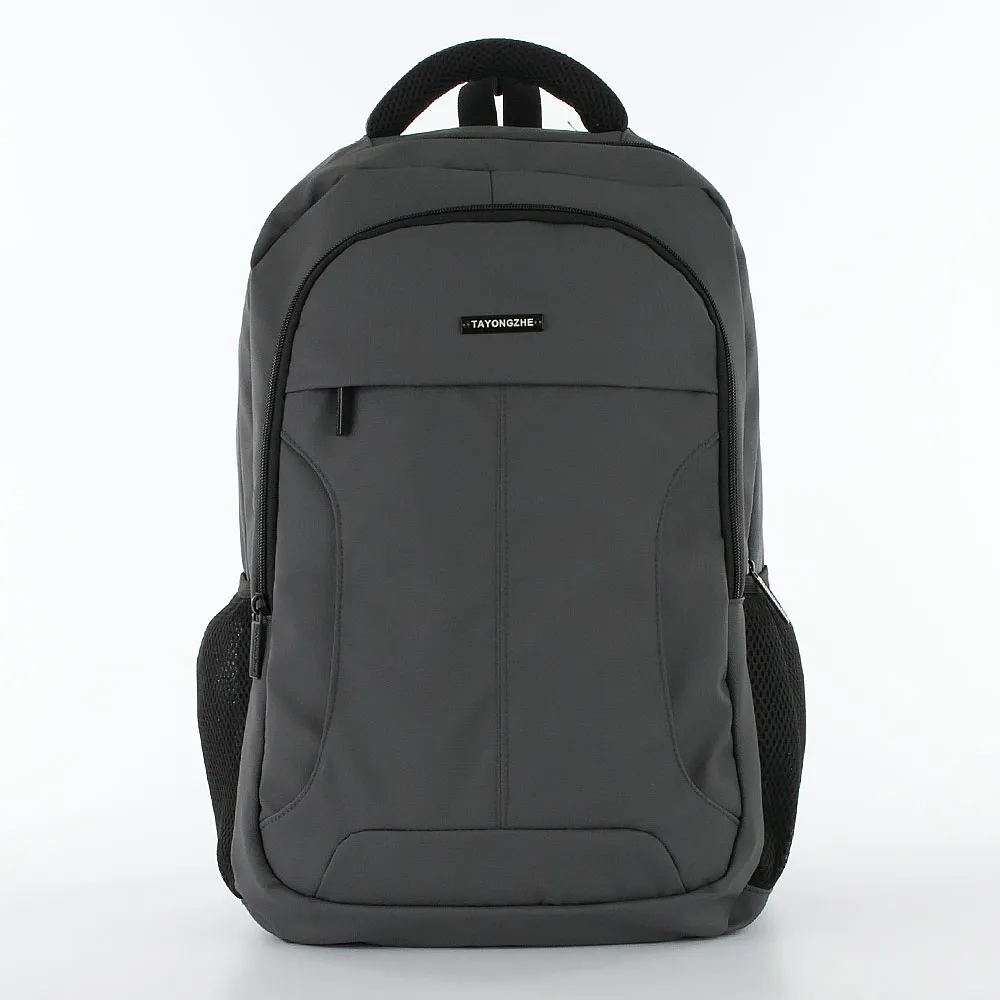 Рюкзак от торговой марки Tayongzhe из плотного текстильного в сочетании серого и черного цвета. Модель с плотной ручкой, лямкой-переноской, уплотненными регулируемыми плечевыми лямками с нагрудным фиксатором для распределения нагрузки. Два отделения на молнии. В основном: текстильная подкладка, накладной карман с уплотненной стенкой для ноутбука. В переднем отделении – накладной карман с органайзером. Уплотненная спинка с анатомическими вставками; имеется лямка для крепления на выдвижную ручку чемодана. По бокам – карман-сетка.
