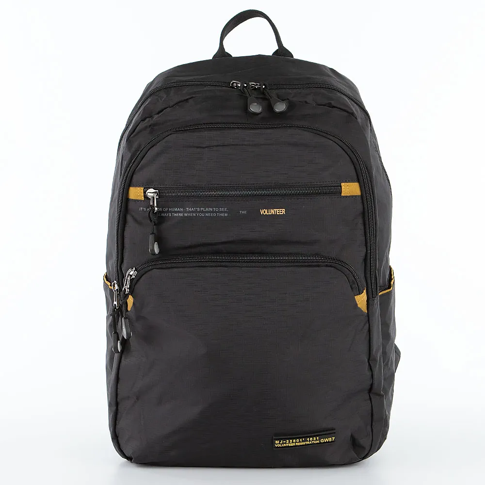 Рюкзак от торговой марки Volunteer из практичного прочного текстильного материала черного цвета. Модель с лямкой-переноской, регулируемыми плечевыми лямками с дышащим верхним слоем, с нагрудным фиксатором для равномерного распределения нагрузки. Отделение на молнии. Внутри: текстильная подкладка, карман на молнии, карман с уплотненной стенкой, два накладных кармана. На лицевой стороне – два кармана на молнии. На задней стороне – карман на молнии. По бокам – карман без застежки. Спинка с анатомической вставкой с дышащим верхним слоем.