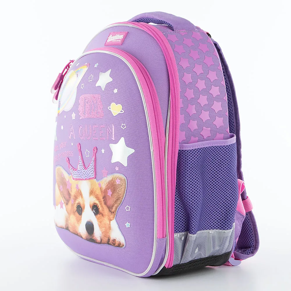 Ранец от торговой марки Seventeen из текстильного материала. Корпус, боковые части и спинка выполнены из легкого водонепроницаемого материала EVA. Модель жесткой конструкции с лямкой-переноской, плотной ручкой, набивными широкими регулируемыми плечевыми лямками с нагрудным фиксатором-стяжкой для распределения нагрузки, металлическими крючками для крепления мешка для обуви. Два отделения на молнии по всему периметру, что облегчает доступ внутрь и уход; внутри: фирменная подкладка. Стенка переднего отделения представляет собой формованную панель, декорированную оригинальным принтом с щенком корги в короне из пайеток и надписью: «I’m a Queen»; звезды выполнены из голографической печати, надписи и мелкие звездочки выполнены из глиттера, звезды по бокам рюкзака - плотная пафф печать. Внутри: органайзер, кольцо для крепления и карман на молнии; пуллер в виде помпона. Основное отделение дополнительно закрывается кодовым замком. Внутри: два накладных кармана-разделителя, фиксирующая резинка. По бокам – карман-сетка на резинке. Анатомическая вентилируемая спинка с верхним дышащим слоем. Прорезиненное дно оснащено ножками для защиты от износа. Светоотражающие элементы на боковых карманах, лямке и окантовке повышают безопасность ребенка в темное время."