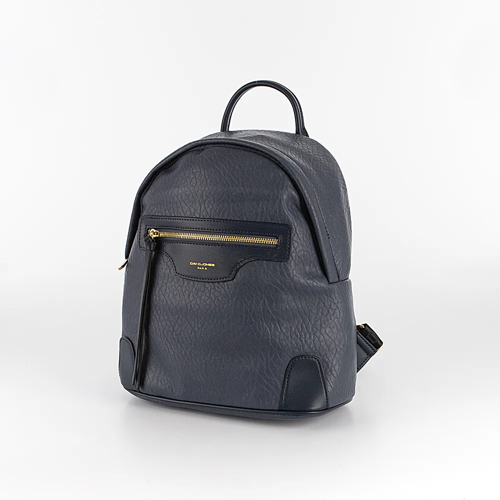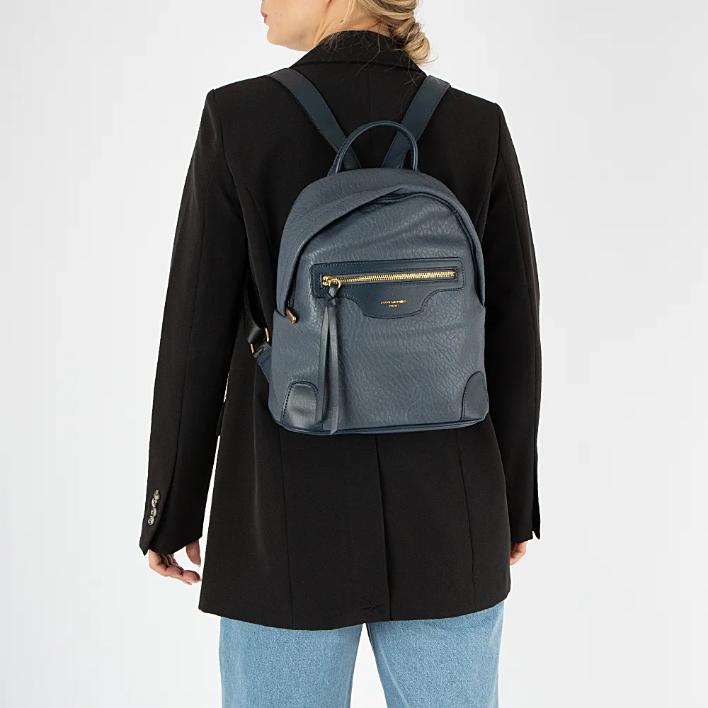 Рюкзак от торговой марки David Jones из искусственной кожи синего цвета. Модель с плотной лямкой-переноской, регулируемыми плечевыми лямками, комбинированными с текстильным материалом. Отделение на молнии. Внутри: фирменная подкладка, карман на молнии, накладной карман. На лицевой и задней сторонах карман на молнии.