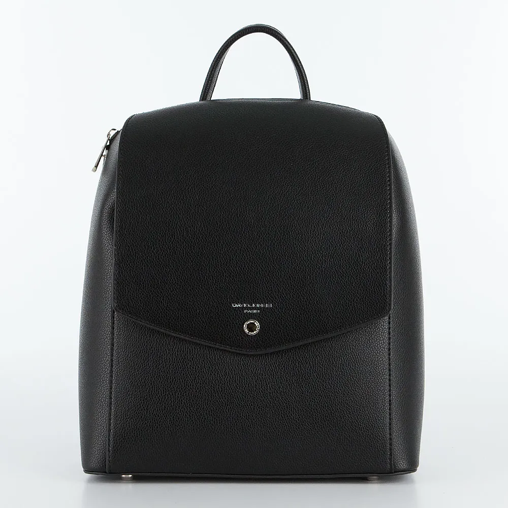 Рюкзак от торговой марки David Jones из искусственной кожи черного цвета. Модель с плотной лямкой-переноской и регулируемыми плечевыми лямками. Отделение на молнии по трем сторонам, что обеспечивает удобный доступ. Внутри: фирменная подкладка, карман на молнии, накладной карман. На лицевой стороне – накладной карман с клапаном на магнитной кнопке. На задней стороне – карман на молнии. Дно оснащено металлическими ножками для защиты от износа.