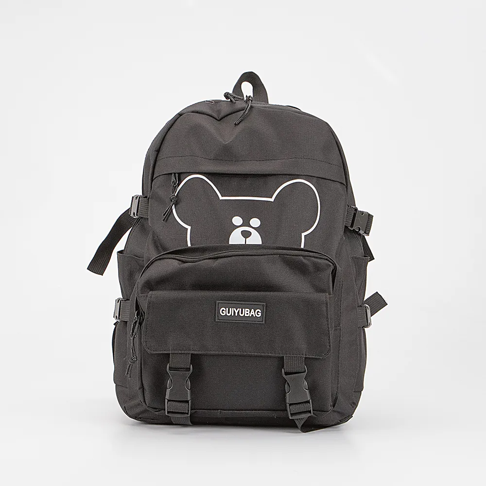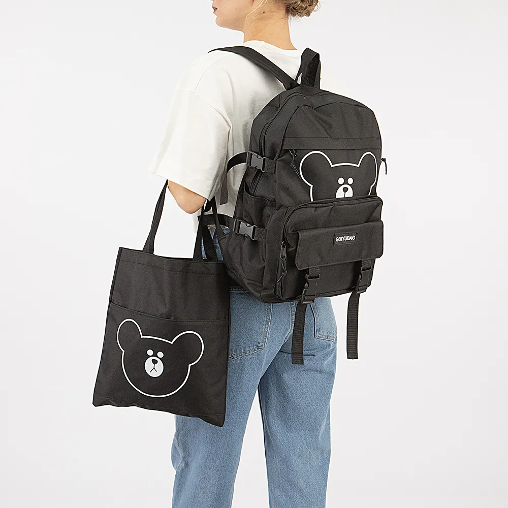 Набор от торговой марки Ecotope из текстильного материала черного цвета. В наборе: рюкзак, сумка-шоппер, сумка на пояс, пенал; декорированы изображением мишки. Рюкзак с лямкой-переноской и регулируемыми плечевыми лямками. Отделение на молнии. Внутри: текстильная подкладка, накладной карман с уплотненной стенкой. На лицевой стороне – два кармана на молнии, карман с застежками фастекс. По бокам – накладной карман, стягивающие ремни. Сумка-шоппер без подкладки; на лицевой стороне – карман на молнии. Сумка на пояс и пенал с отделением на молнии без подкладки.