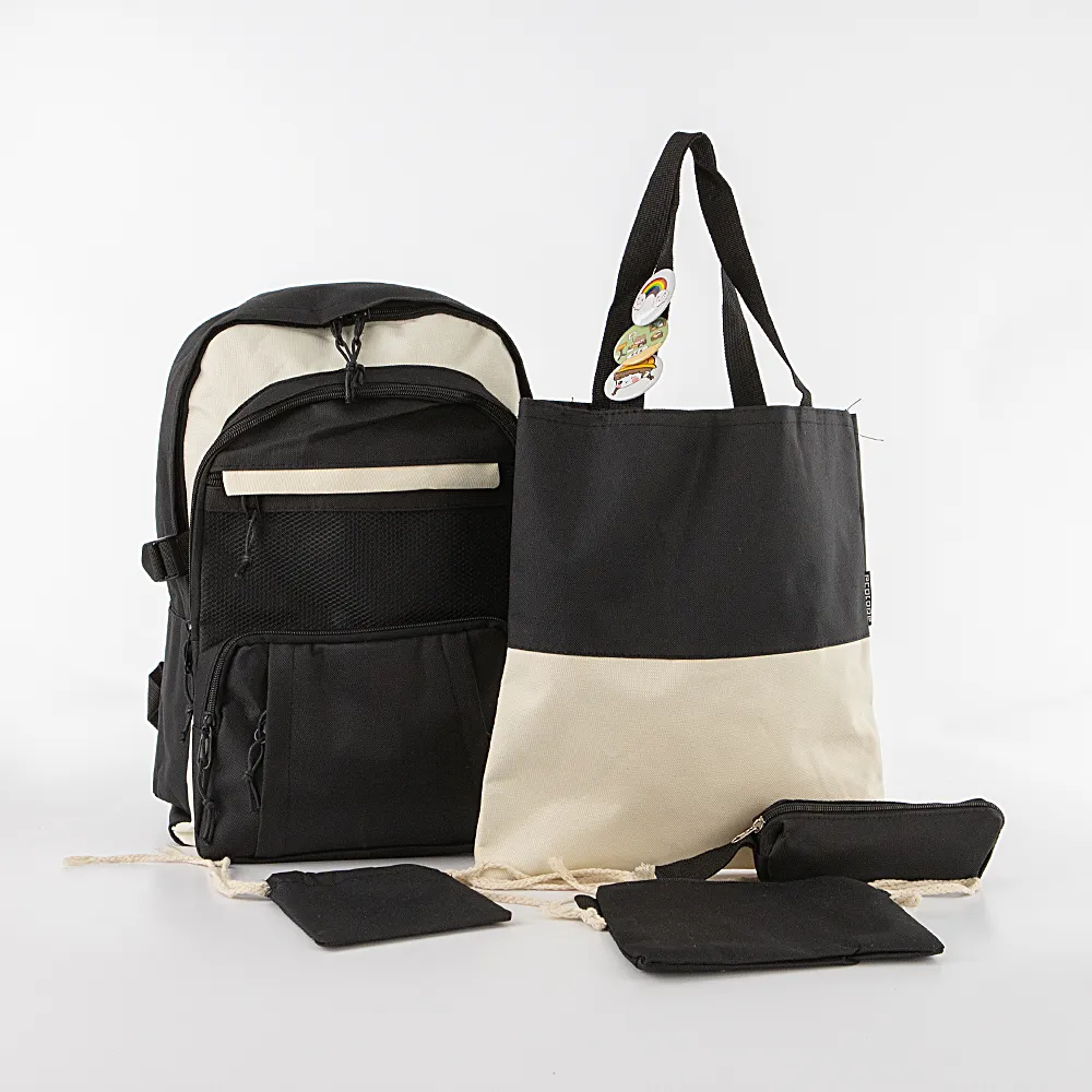 Набор от торговой марки Ecotope из текстильного материала в сочетании черного и белого цвета. Набор состоит из рюкзака, сумки-шоппера, пенала и кошелька. Рюкзак с лямкой-переноской и регулируемыми плечевыми лямками. Два отделения на молнии, с текстильной подкладкой. В основном отделении – накладной карман. На лицевой стороне – четыре кармана на молнии. По бокам – стягивающие ремни-фиксаторы. Вместительный шоппер с двумя ручками. Пенал с отделением на молнии и петлей для крепления. В комплекте имеются декоративные значки.