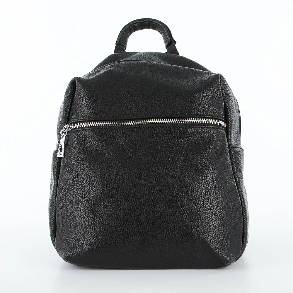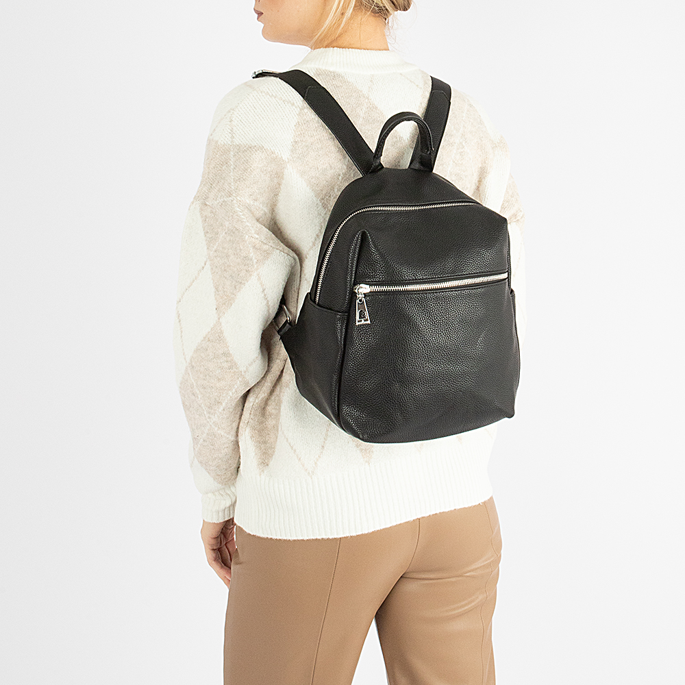 Рюкзак от торговой марки Passo Avanti из искусственной кожи черного цвета. Модель с лямкой-переноской, регулируемыми плечевыми лямками. Отделение на молнии. Внутри: карман на молнии, накладной карман, перегородка с карманом на молнии, образующая накладной карман. На лицевой стороне – карман на молнии. На задней стороне – вертикальный карман на молнии.