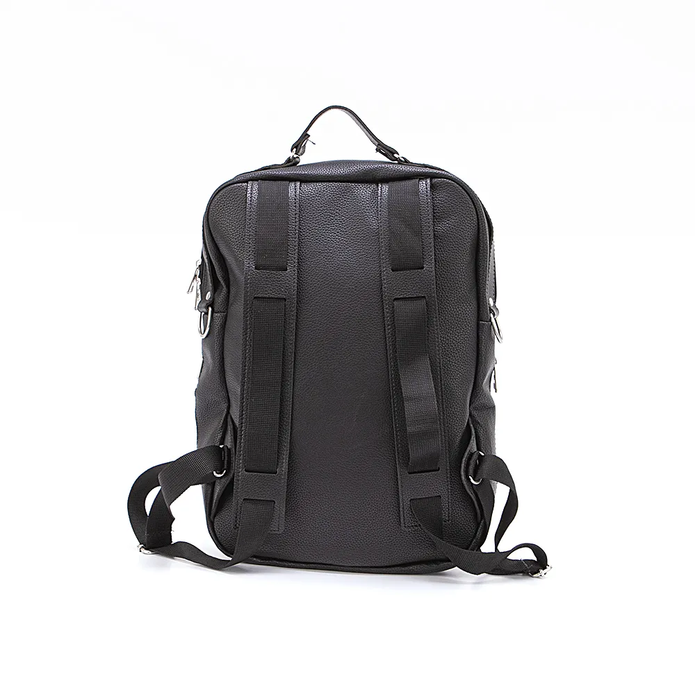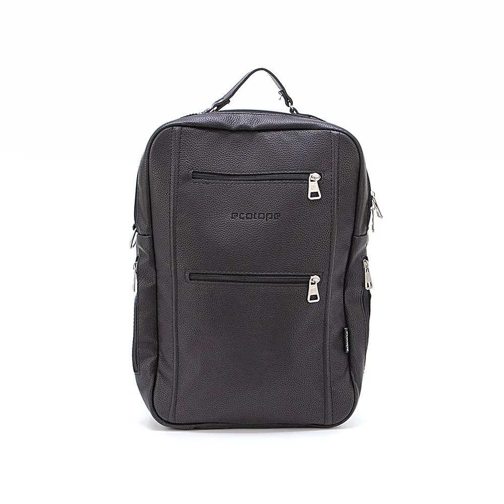 Рюкзак от торговой марки Ecotope из искусственной кожи черного цвета. Модель с одной ручкой и регулируемыми плечевыми лямками. Отделение на молнии. Внутри: текстильная подкладка, накладной карман с уплотненной стенкой. На лицевой стороне – два кармана на молнии.