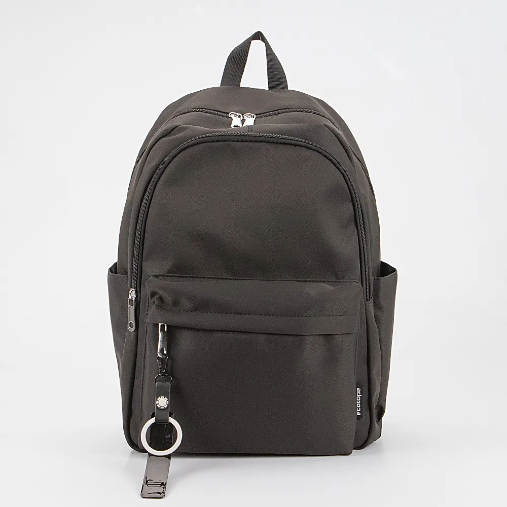 Рюкзак от торговой марки Ecotope из текстильного материала черного цвета. Вместительная модель с лямкой-переноской и регулируемыми плечевыми лямками. Два отделения на молнии, с текстильной подкладкой. В основном отделении: накладной карман с уплотненной стенкой. На лицевой стороне – накладной карман на молнии с оригинальным пуллером. На спинке – карман-антивор на молнии. По бокам – вместительный накладной карман.