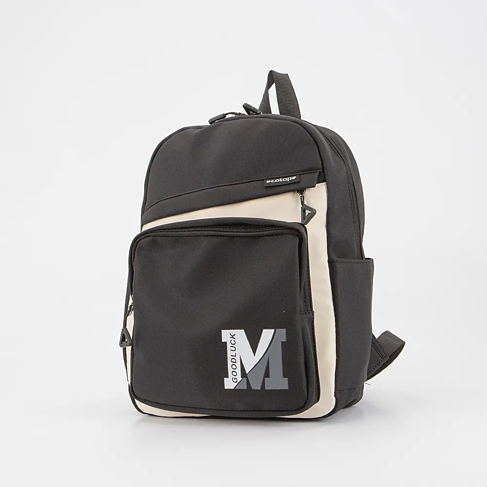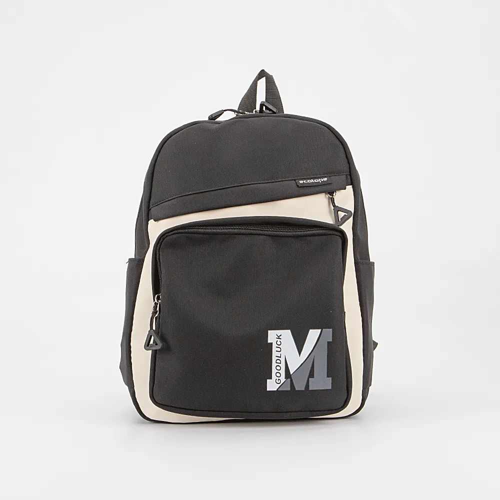 Рюкзак от торговой марки Ecotope из текстильного материала черного цвета с бежевой вставкой. Модель с лямкой и регулируемыми плечевыми лямками. Отделение на молнии. Внутри: текстильная подкладка, накладной карман с уплотненной стенкой. По бокам – накладной карман без застежки. На лицевой стороне – два кармана на молнии. На спинке – вертикальный карман на молнии.