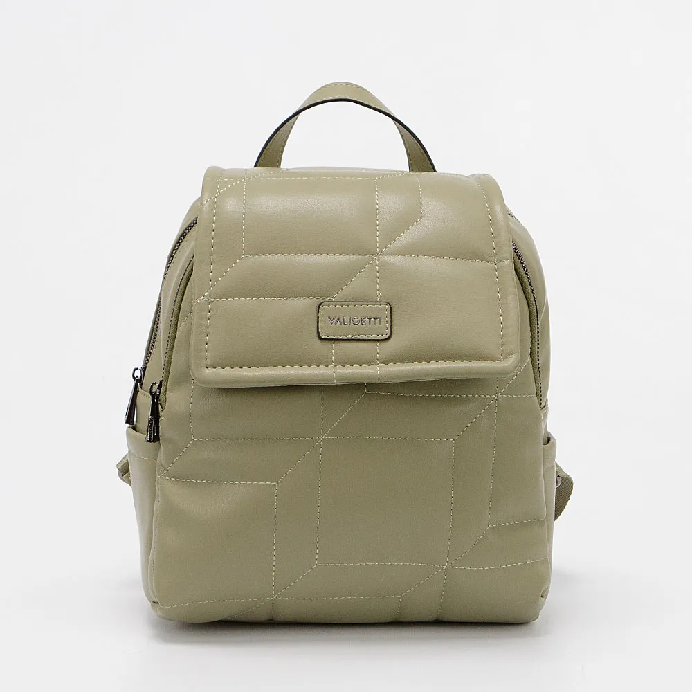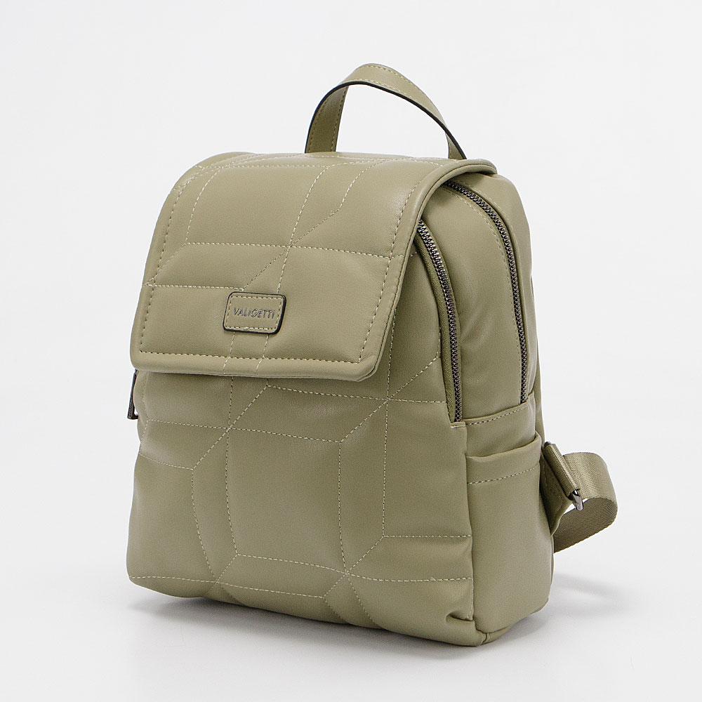 Рюкзак от торговой марки Valigetti из искусственной кожи оливкового цвета. Декорирована оригинальной стежкой. Модель с лямкой-переноской и регулируемыми плечевыми лямками. Клапан на магнитной кнопке закрывает накладной карман на молнии и отделение на молнии. Внутри: фирменная подкладка, карман на молнии. На спинке – вертикальный карман на молнии. По бокам – накладной карман.