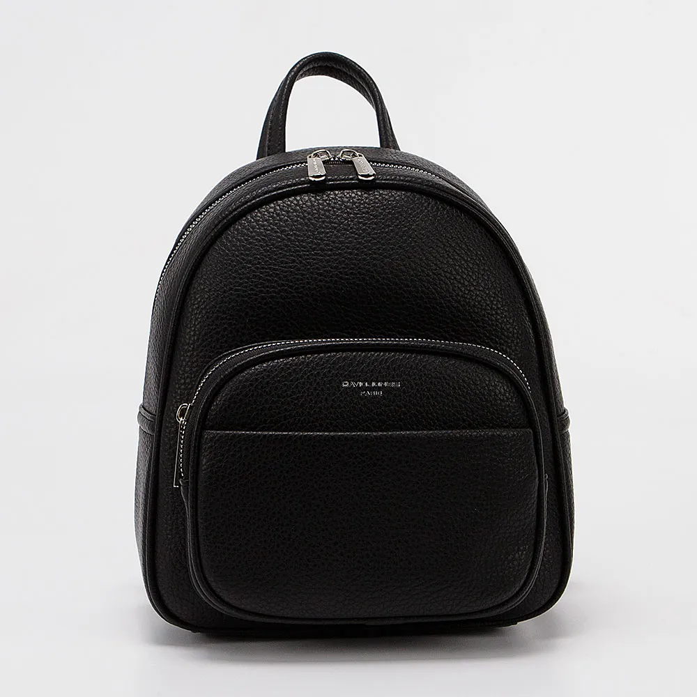 Рюкзак от торговой марки David Jones из искусственной кожи черного цвета. Компактная модель с лямкой-переноской и регулируемыми плечевыми лямками. Отделение на молнии. Внутри: фирменная подкладка, карман на молнии, накладной карман. На лицевой стороне – карман на молнии, накладной карман на магнитной кнопке. На задней стороне – карман на молнии.