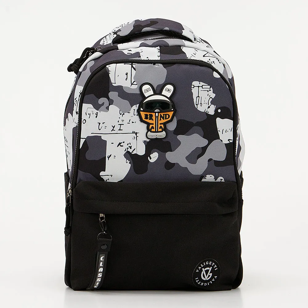 Рюкзак от торговой марки Valigetti из текстильного материала с принтом «камуфляж». Модель с лямкой-переноской и мягкой набивной ручкой, широкими плотными регулируемыми плечевыми лямками. Два отделения на молнии, с текстильной подкладкой. В основном отделении – накладной карман с уплотненной стенкой. На лицевой стороне, декорированной прорезиненной нашивкой в виде зайца в очках, имеется карман на молнии. На спинке – лямка для крепления на выдвижную ручку чемодана.