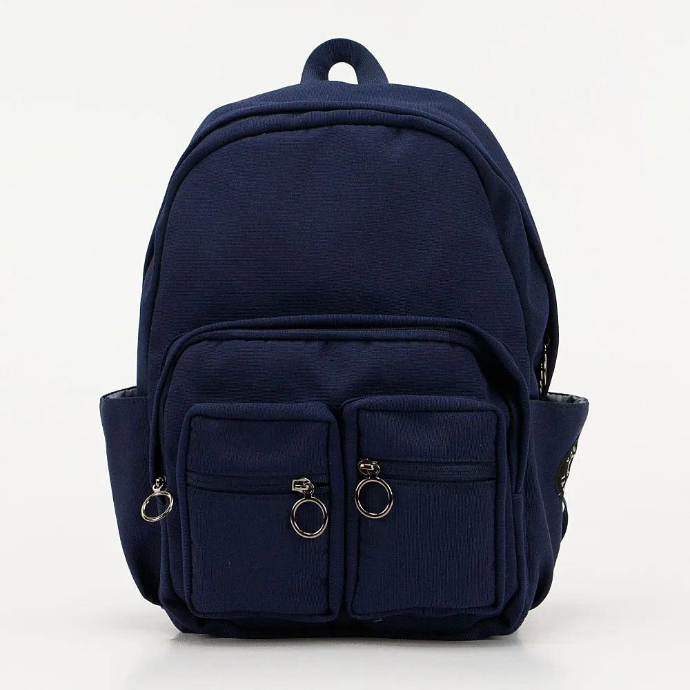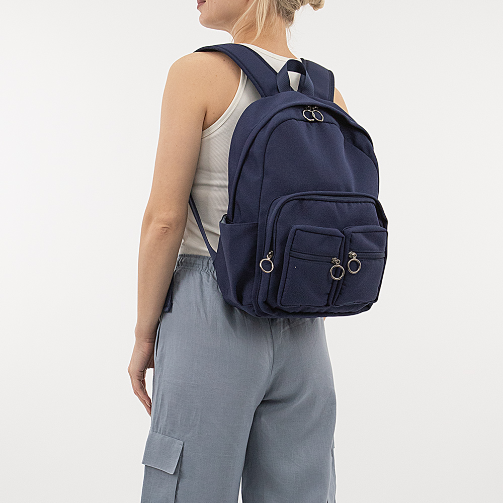 Рюкзак от торговой марки Valigetti из текстильного материала темно-синего цвета. Модель с лямкой-переноской и широкими плотными регулируемыми плечевыми лямками. Отделение на молнии. Внутри: текстильная подкладка, два накладных кармана, один из которых с уплотненной стенкой для гаджета. На лицевой стороне – три накладных кармана на молнии. На спинке – лямка для крепления на выдвижную ручку чемодана. По бокам – накладной карман.