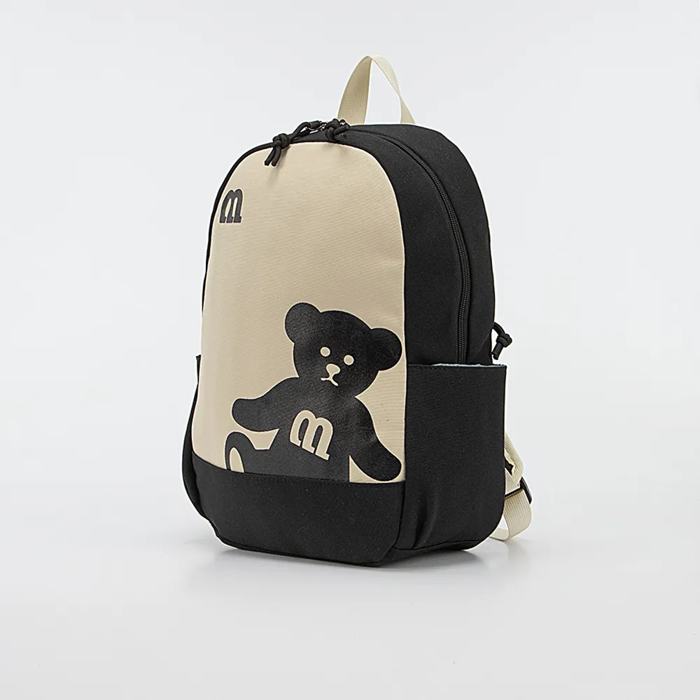 Рюкзак от торговой марки Valigetti из текстильного материала в сочетании черного и бежевого цвета. Лицевая сторона декорирован принтом с изображением мишки. Модель с лямкой-переноской, плотными регулируемыми плечевыми лямками. Отделение на молнии. Внутри: текстильная подкладка, два накладных кармана, вместительный накладной карман с уплотненной стенкой для ноутбука. По бокам – накладной карман без застежки. На спинке имеется карман-антивор на молнии.