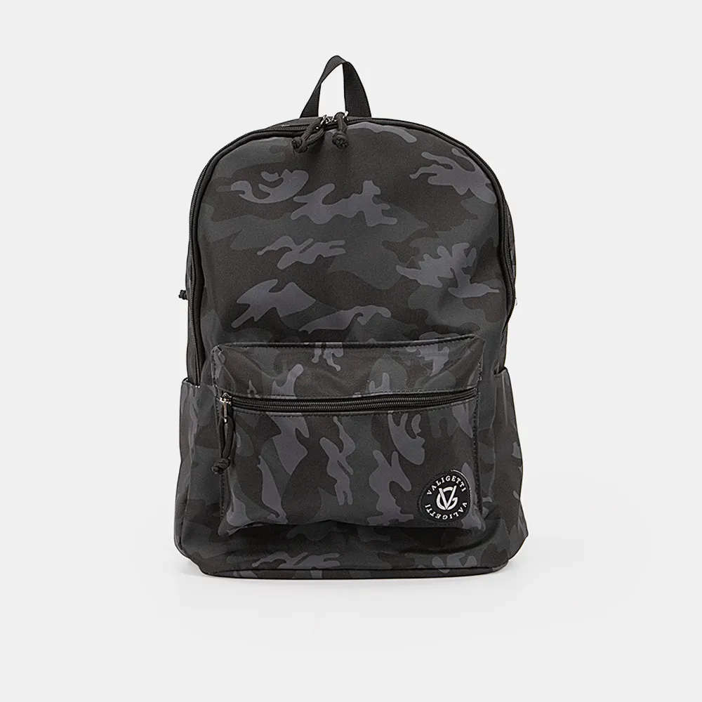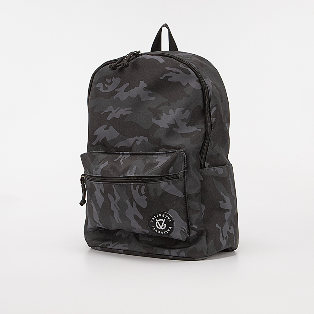 Рюкзак от торговой марки Valigetti из текстильного материала с принтом «камуфляж». Модель с лямкой-переноской и широкими плотными регулируемыми плечевыми лямками. Отделение на молнии. Внутри: текстильная подкладка, три накладных кармана, один из которых с уплотненной стенкой для гаджета. На лицевой и задней сторонах – карман на молнии. По бокам – накладной карман. На спинке имеется лямка для крепления на выдвижную ручку чемодана.